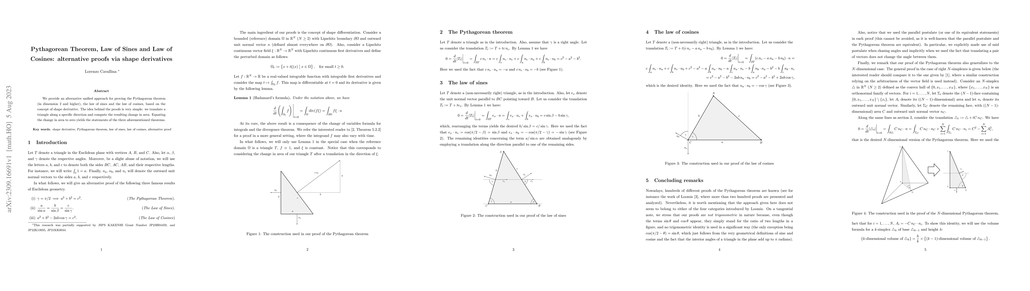 We provide an alternative unified approach for proving the Pythagorean theorem (in dimension $2$ and higher), the law of sines and the law of cosines, based on the concept of shape derivative. The idea behind the proofs is very simple: we translate a triangle along a specific direction and compute the resulting change in area. Equating the change in area to zero yields the statements of the three aforementioned theorems.