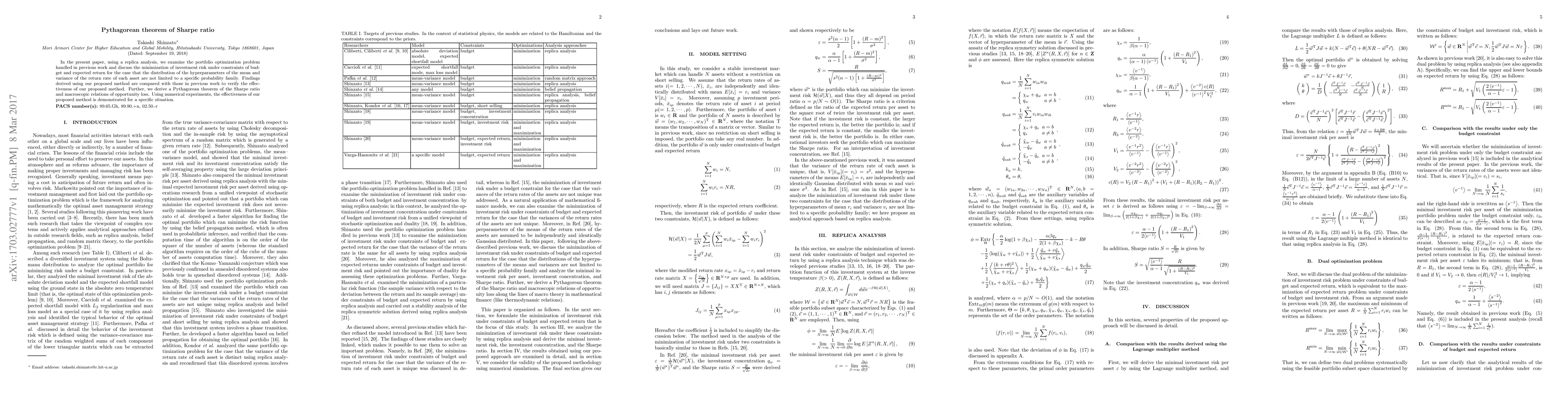 In the present paper, using a replica analysis, we examine the portfolio optimization problem handled in previous work and discuss the minimization of investment risk under constraints of budget and expected return for the case that the distribution of the hyperparameters of the mean and variance of the return rate of each asset are not limited to a specific probability family. Findings derived using our proposed method are compared with those in previous work to verify the effectiveness of our proposed method. Further, we derive a Pythagorean theorem of the Sharpe ratio and macroscopic relations of opportunity loss. Using numerical experiments, the effectiveness of our proposed method is demonstrated for a specific situation.