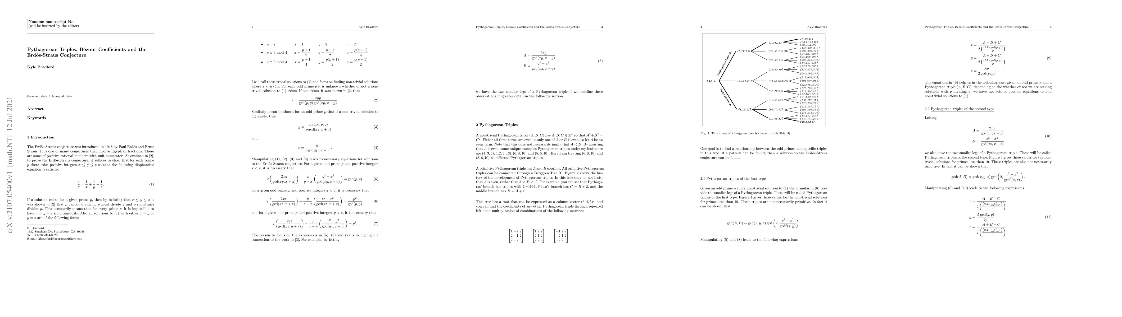 This paper explores the connection between Pythagorean triples and solutions to the Erdős-Straus conjecture for a given prime \( p \), using Bézout coefficients to link the conjecture's solutions to the roots of a second-degree polynomial.
