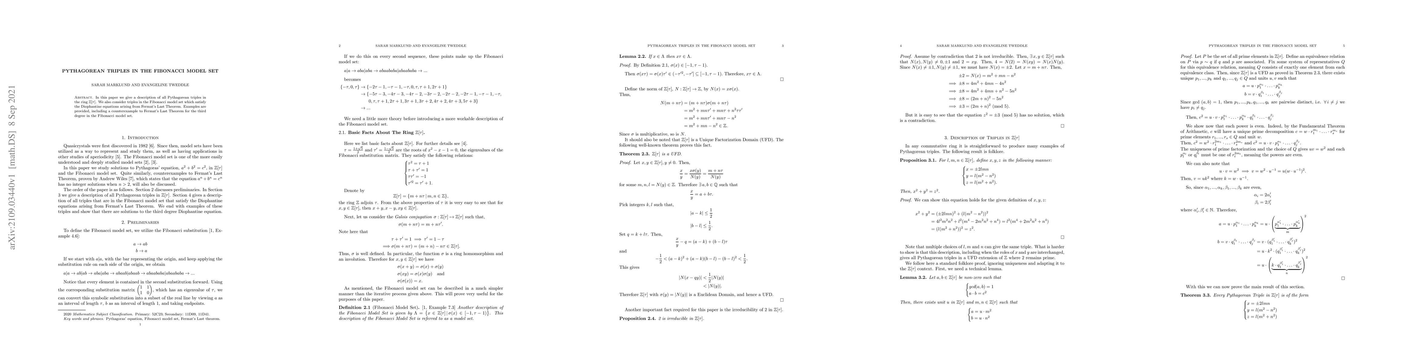 This paper explores Pythagorean triples within the ring ${{\mathbb Z}}[\tau]$ and investigates Fibonacci model set triples that meet Diophantine equations related to Fermat's Last Theorem, providing a counterexample to the theorem in the third-degree Fibonacci model.