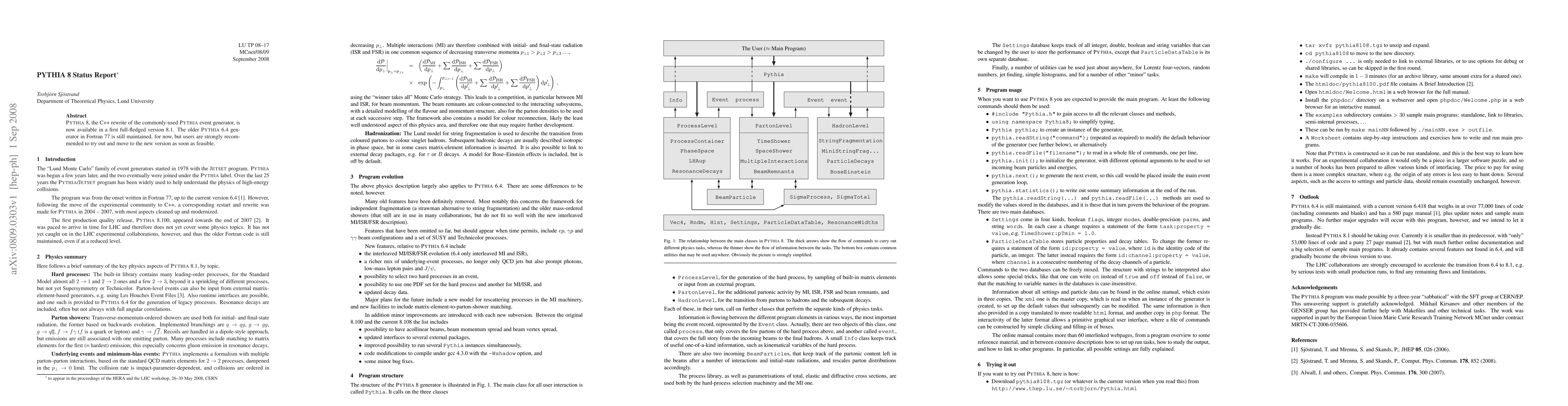 Pythia 8, the C++ rewrite of the commonly-used Pythia event generator, is now available in a first full-fledged version 8.1. The older Pythia 6.4 generator in Fortran 77 is still maintained, for now, but users are strongly recommended to try out and move to the new version as soon as feasible.