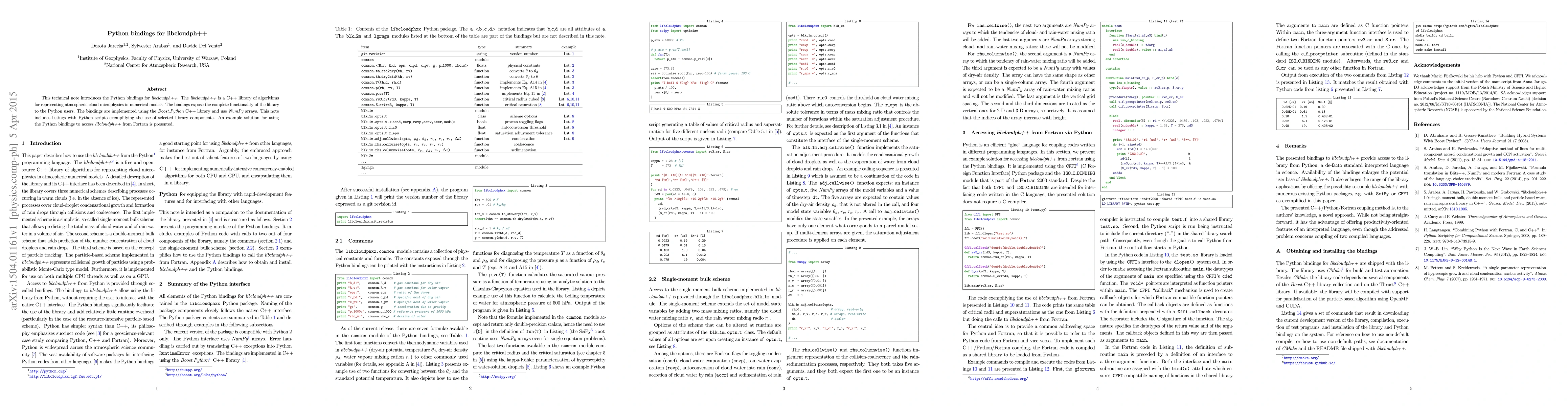 This paper presents Python bindings for libcloudph++, a C++ library for atmospheric cloud microphysics, enabling Python users to access its algorithms. The bindings utilize Boost.Python and NumPy, with examples demonstrating their use and an example solution for interfacing with Fortran.
