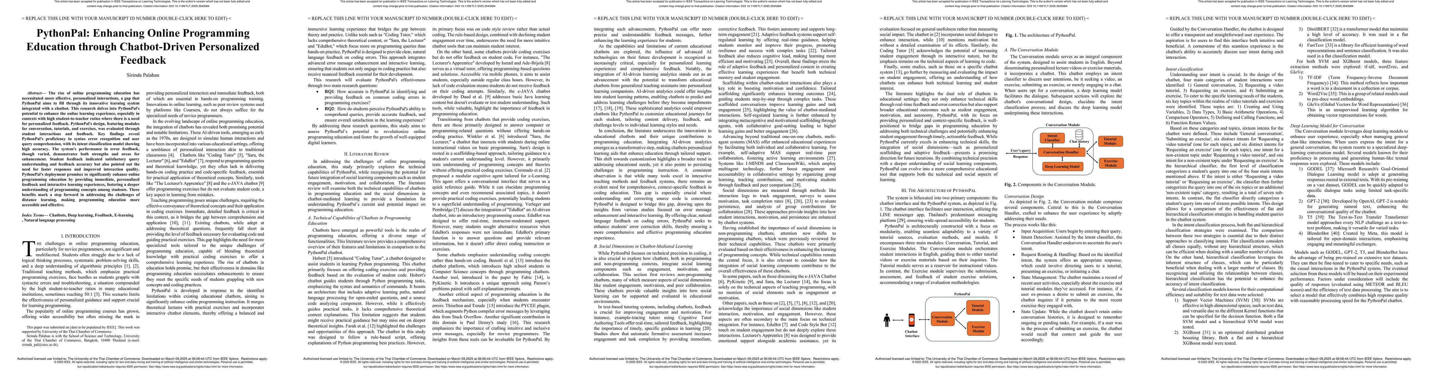 PythonPal, a chatbot-driven learning system with modules for conversation, tutorials, and exercises, offering personalized feedback in programming education.