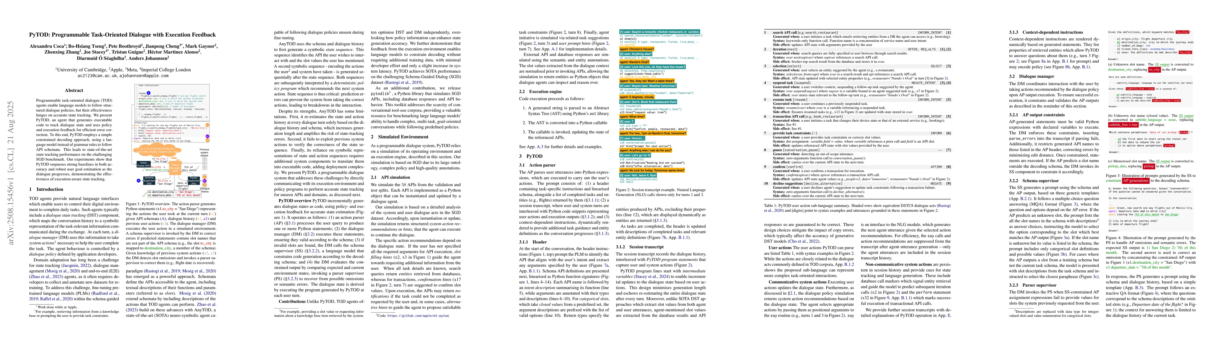 Programmable task-oriented dialogue (TOD) agents enable language models to follow structured dialogue policies, but their effectiveness hinges on accurate state tracking. We present PyTOD, an agent that generates executable code to track dialogue state and uses policy and execution feedback for efficient error correction. To this end, PyTOD employs a simple constrained decoding approach, using a language model instead of grammar rules to follow API schemata. This leads to state-of-the-art state tracking performance on the challenging SGD benchmark. Our experiments show that PyTOD surpasses strong baselines in both accuracy and robust user goal estimation as the dialogue progresses, demonstrating the effectiveness of execution-aware state tracking.