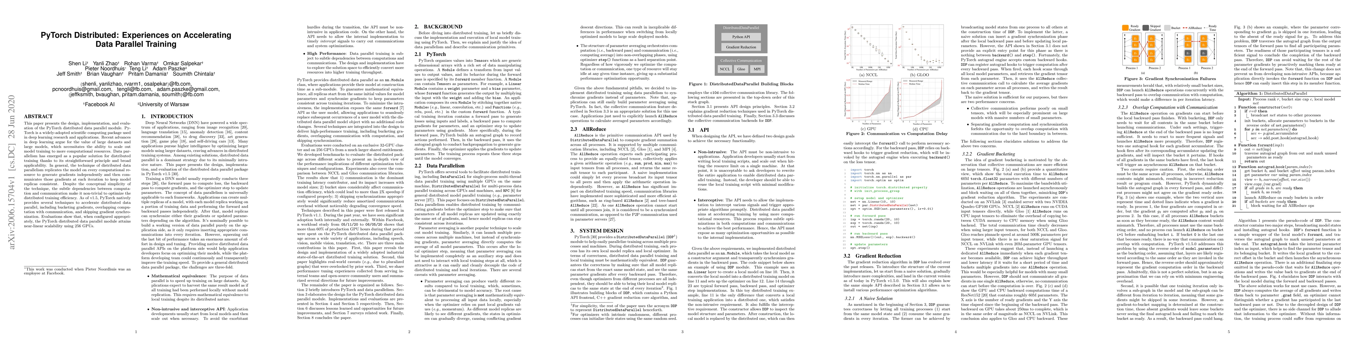 This paper details the design and implementation of PyTorch's distributed data parallel module, highlighting techniques like gradient bucketing and communication overlap to optimize training efficiency, achieving near-linear scalability across 256 GPUs.