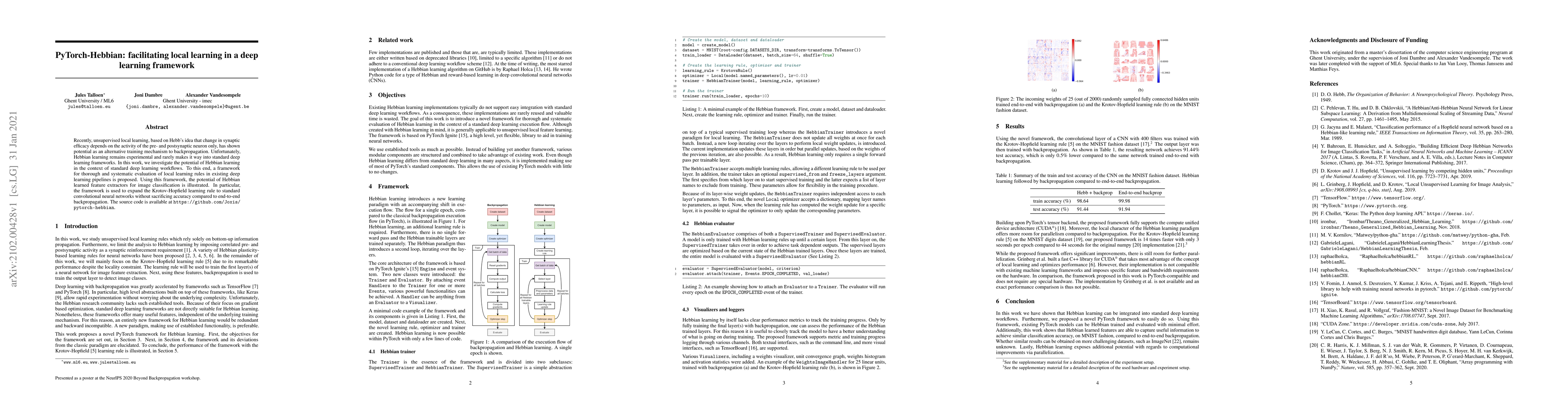 This paper proposes a framework for integrating Hebbian learning into standard deep learning workflows using PyTorch, demonstrating its potential through convolutional neural networks. The study shows that Hebbian learning can achieve comparable accuracy to backpropagation, expanding the Krotov-Hopfield learning rule to this context.