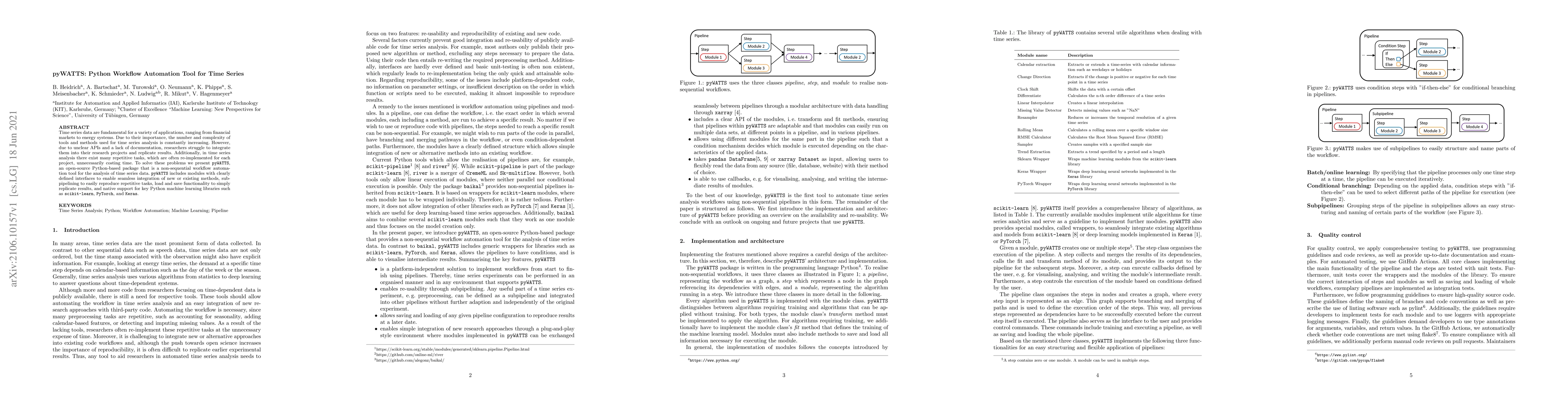 **Summary:** pyWATTS is an open-source Python package designed to automate workflows for time series analysis, addressing the challenges of unclear APIs and lack of documentation. It facilitates seamless integration of new methods, subpipelining for repetitive tasks, and supports key machine learning libraries.