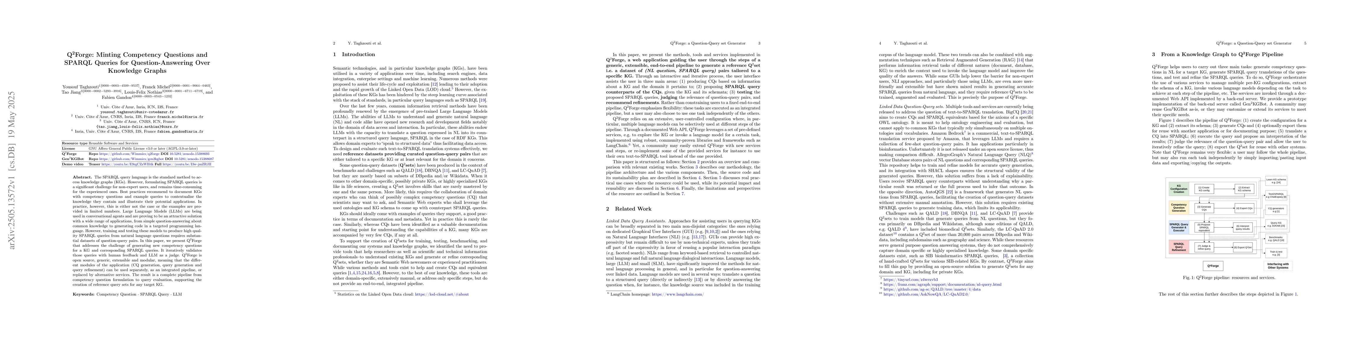 This research is significant as it addresses the challenge of formulating SPARQL queries, which is difficult for non-expert users and time-consuming for experts. By automating the generation of competency questions and SPARQL queries, Q${}^2$Forge supports the creation of reference query sets for any KG, enhancing accessibility and usability.