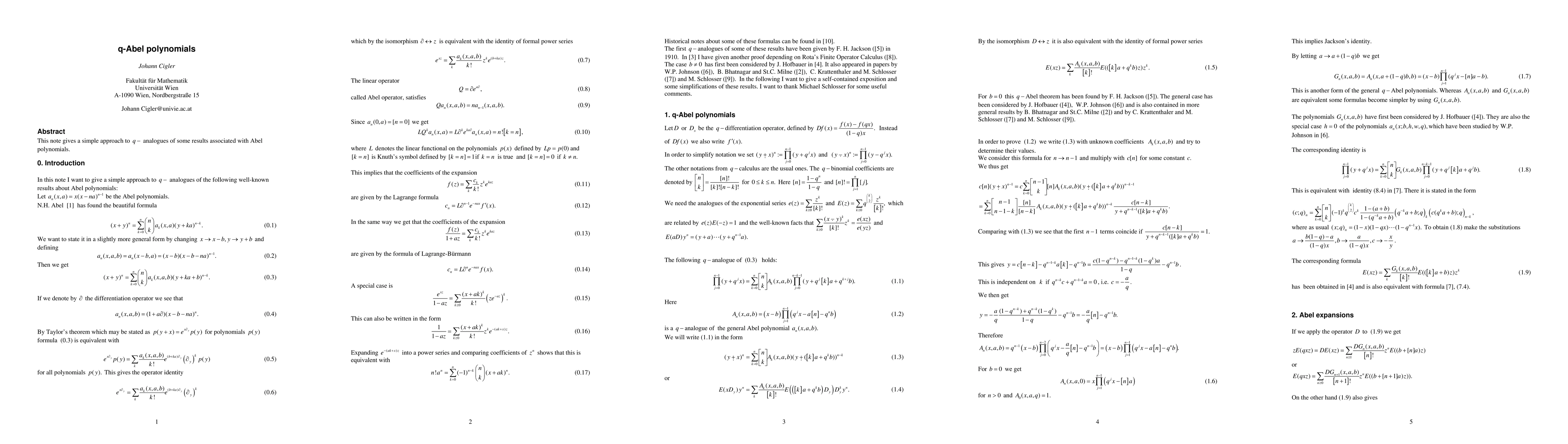 Summary: The paper presents an accessible method for deriving q-analogues of results linked to Abel polynomials, enhancing understanding of these mathematical constructs.