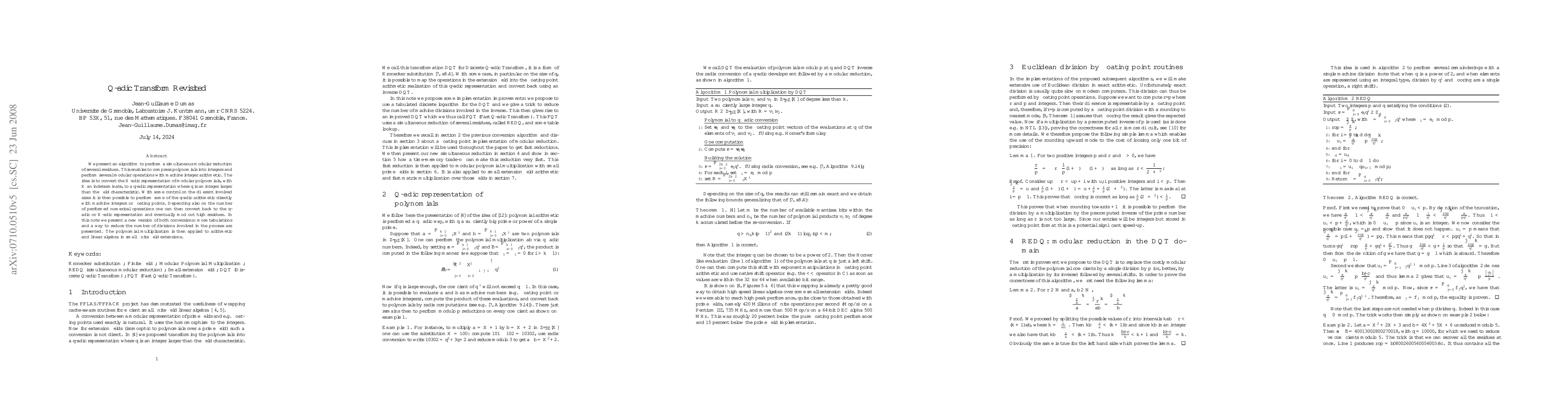 We present an algorithm to perform a simultaneous modular reduction of several residues. This algorithm is applied fast modular polynomial multiplication. The idea is to convert the $X$-adic representation of modular polynomials, with $X$ an indeterminate, to a $q$-adic representation where $q$ is an integer larger than the field characteristic. With some control on the different involved sizes it is then possible to perform some of the $q$-adic arithmetic directly with machine integers or floating points. Depending also on the number of performed numerical operations one can then convert back to the $q$-adic or $X$-adic representation and eventually mod out high residues. In this note we present a new version of both conversions: more tabulations and a way to reduce the number of divisions involved in the process are presented. The polynomial multiplication is then applied to arithmetic in small finite field extensions.