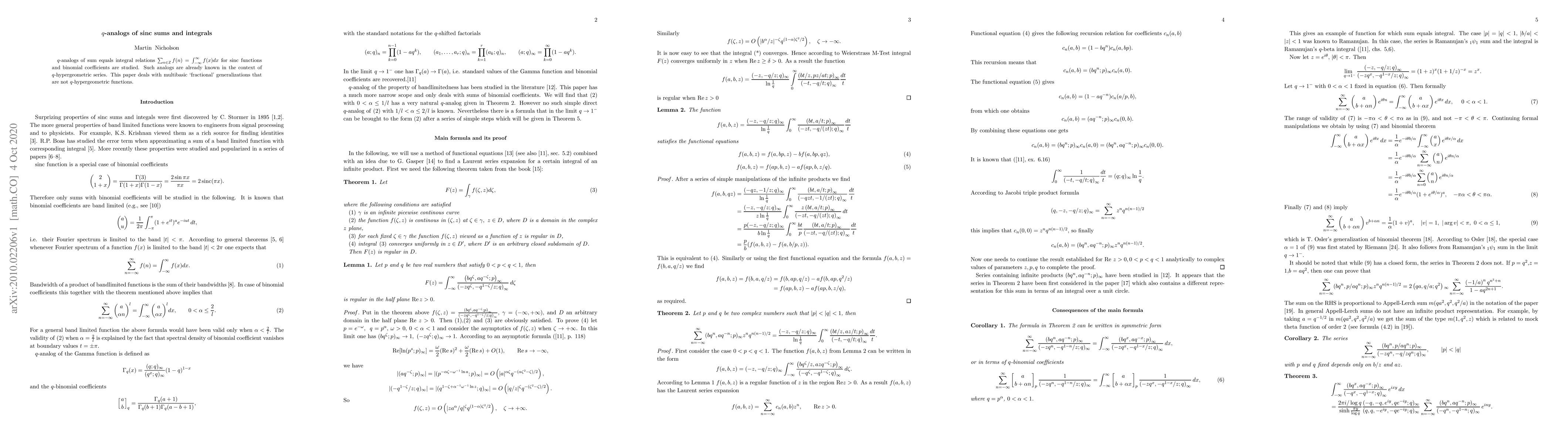 This paper studies q-analogs of sum equals integral relations for sinc functions and binomial coefficients, extending existing knowledge from q-hypergeometric series to multibasic fractional generalizations.