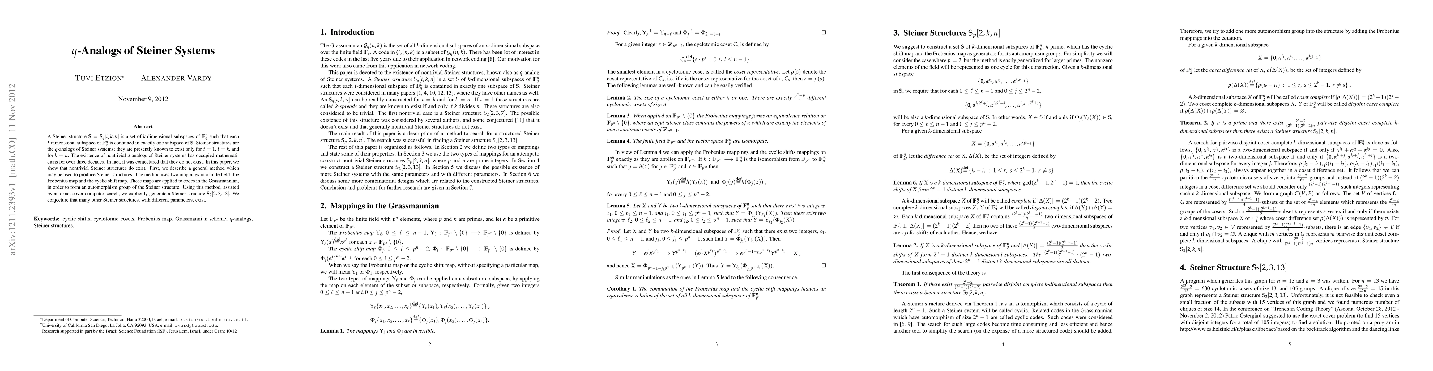 A Steiner structure $\dS = \dS_q[t,k,n]$ is a set of $k$-dimensional subspaces of $\F_q^n$ such that each $t$-dimensional subspace of $\F_q^n$ is contained in exactly one subspace of $\dS$. Steiner structures are the $q$-analogs of Steiner systems; they are presently known to exist only for $t = 1$, $t=k$, and\linebreak for $k = n$. The existence of nontrivial $q$-analogs of Steiner systems has occupied mathematicians for over three decades. In fact, it was conjectured that they do not exist. In this paper, we show that nontrivial Steiner structures do exist. First, we describe a general method which may be used to produce Steiner structures. The method uses two mappings in a finite field: the Frobenius map and the cyclic shift map. These maps are applied to codes in the Grassmannian, in order to form an automorphism group of the Steiner structure. Using this method, assisted by an exact-cover computer search, we explicitly generate a Steiner structure $\dS_2[2,3,13]$. We conjecture that many other Steiner structures, with different parameters, exist.