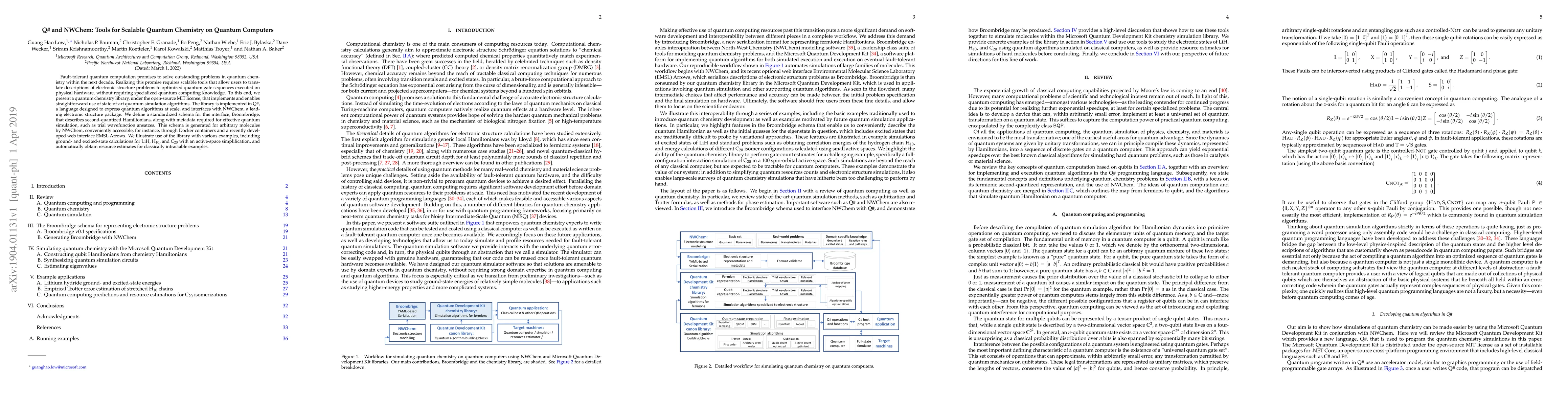 This paper introduces a quantum chemistry library that translates electronic structure problems into quantum gate sequences using Q# and interfaces with NWChem, aiming to make quantum simulations accessible without specialized quantum computing knowledge. The library employs a standardized schema, Broombridge, to describe Hamiltonians and metadata for quantum simulations, facilitating scalable quantum chemistry computations.