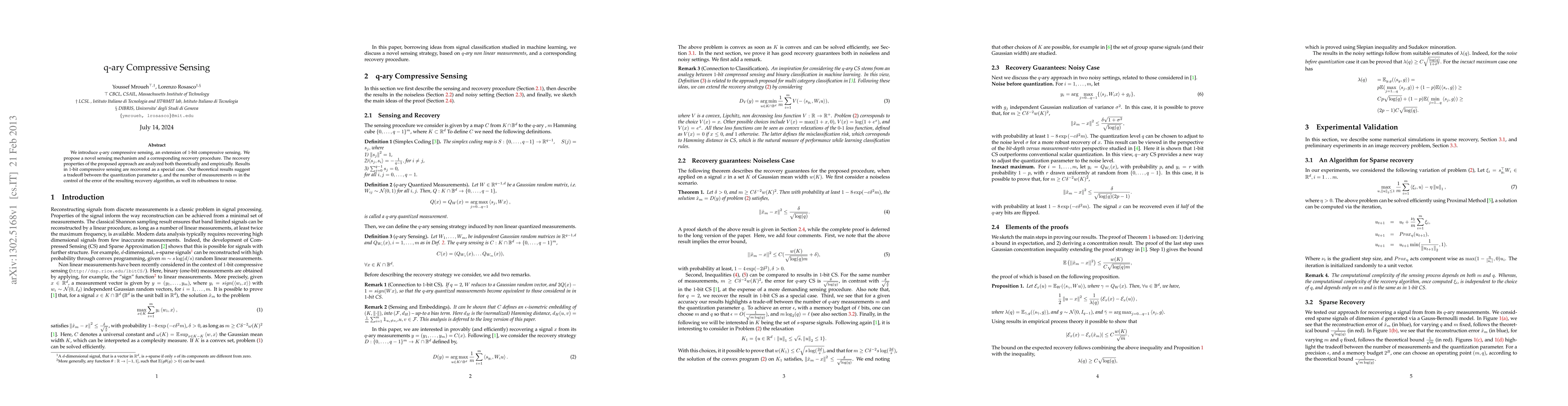 Summary: This paper extends 1-bit compressive sensing to q-ary compressive sensing, proposing a new sensing mechanism and recovery procedure. Theoretical and empirical analyses reveal a tradeoff between quantization parameter q and measurement count m, affecting recovery error and noise robustness.