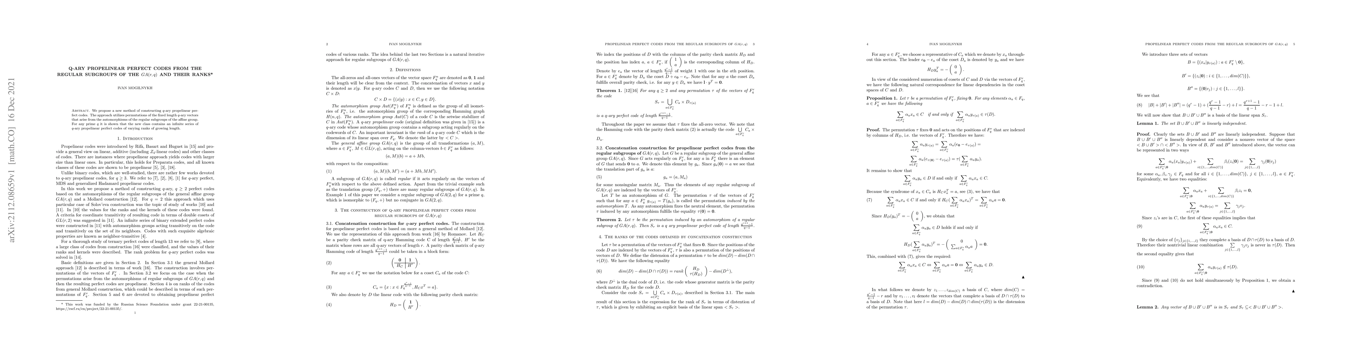 This paper introduces a novel method to construct q-ary propelinear perfect codes using permutations derived from the automorphisms of regular subgroups in the affine group. It demonstrates an infinite series of such codes with varying ranks and increasing lengths for any prime q.