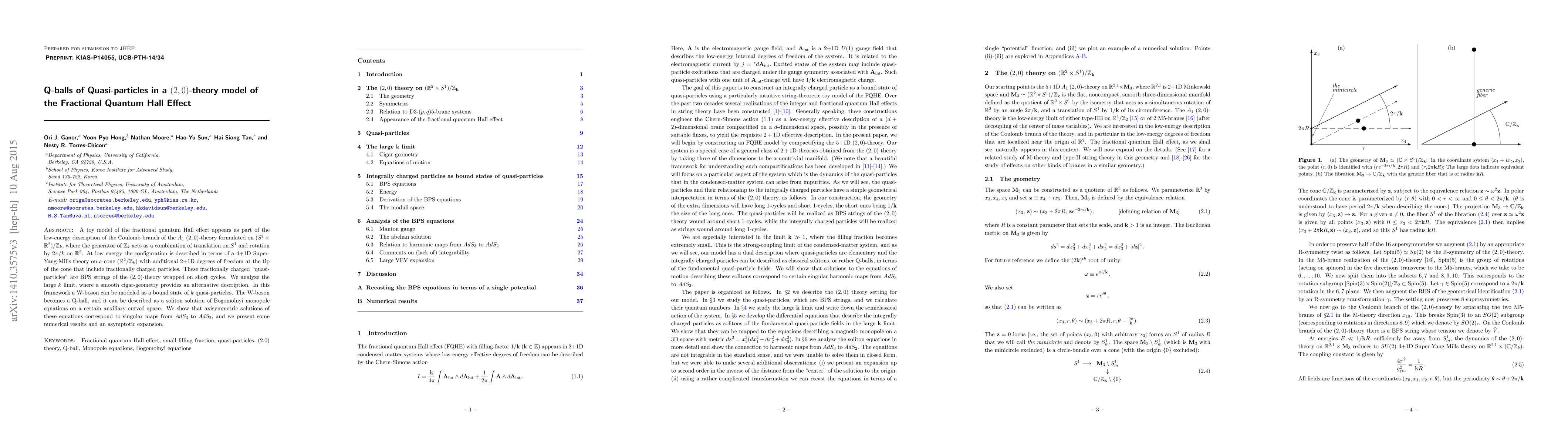 A toy model of the fractional quantum Hall effect appears as part of the low-energy description of the Coulomb branch of the $A_1$ (2,0)-theory formulated on $(S^1\times R^2)/Z_k$, where the generator of $Z_k$ acts as a combination of translation on $S^1$ and rotation by $2\pi/k$ on $R^2$. At low energy the configuration is described in terms of a 4+1D Super-Yang-Mills theory on a cone ($R^2/Z_k$) with additional 2+1D degrees of freedom at the tip of the cone that include fractionally charged particles. These fractionally charged quasi-particles are BPS strings of the (2,0)-theory wrapped on short cycles. We analyze the large $k$ limit, where a smooth cigar-geometry provides an alternative description. In this framework a W-boson can be modeled as a bound state of $k$ quasi-particles. The W-boson becomes a Q-ball, and it can be described as a soliton solution of Bogomolnyi monopole equations on a certain auxiliary curved space. We show that axisymmetric solutions of these equations correspond to singular maps from $AdS_3$ to $AdS_2$, and we present some numerical results and an asymptotic expansion.