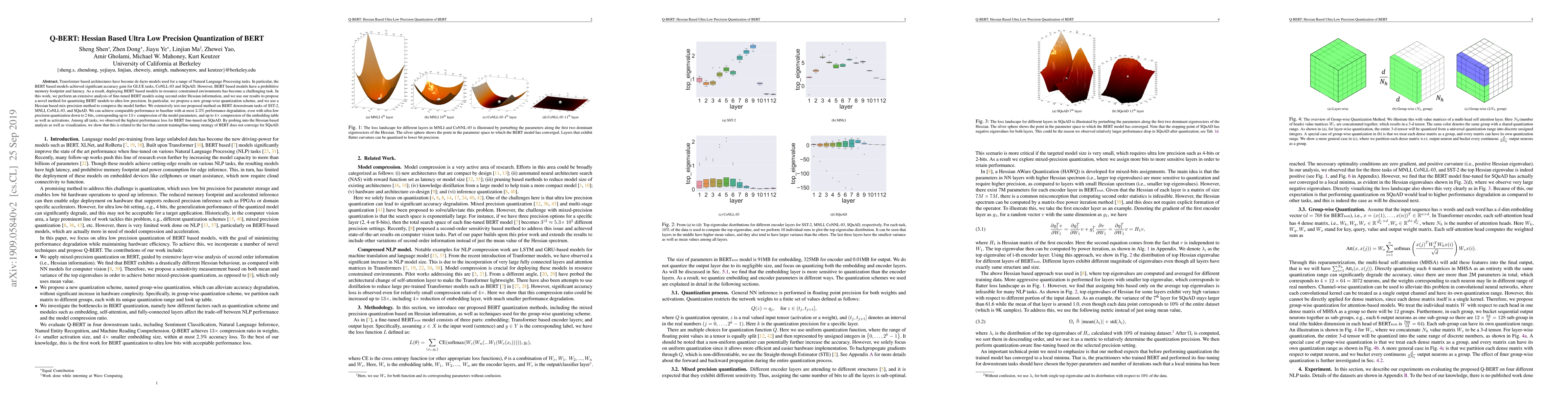 This paper proposes a novel method for ultra low precision quantization of BERT models using second order Hessian information, achieving up to 13x compression with only 2.3% performance degradation on tasks like SST-2 and SQuAD. The method employs a group-wise quantization scheme and a mix-precision approach, demonstrating effective compression while maintaining accuracy.