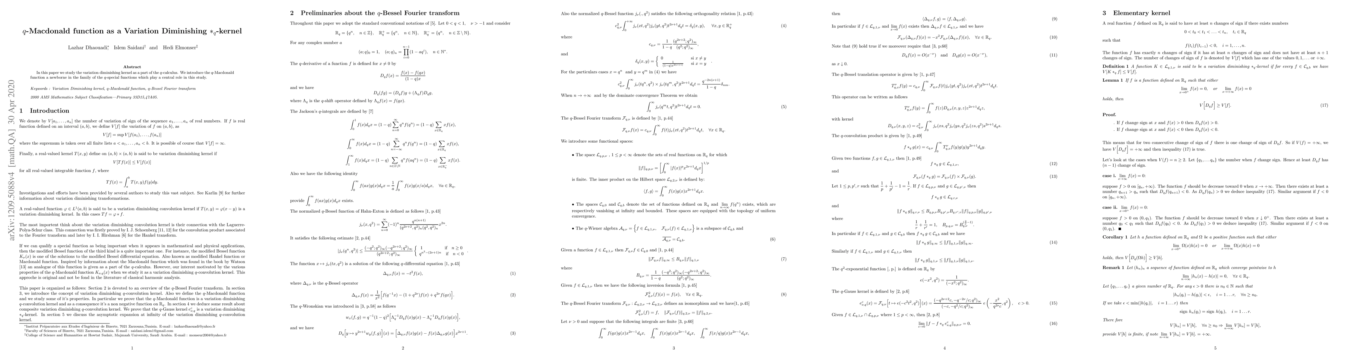 In this paper we study the variation diminishing kernel as a part of the $q$-calculus. We introduce the $q$-Macdonald function a newborne in the family of the $q$-special functions which play a central role in this study.