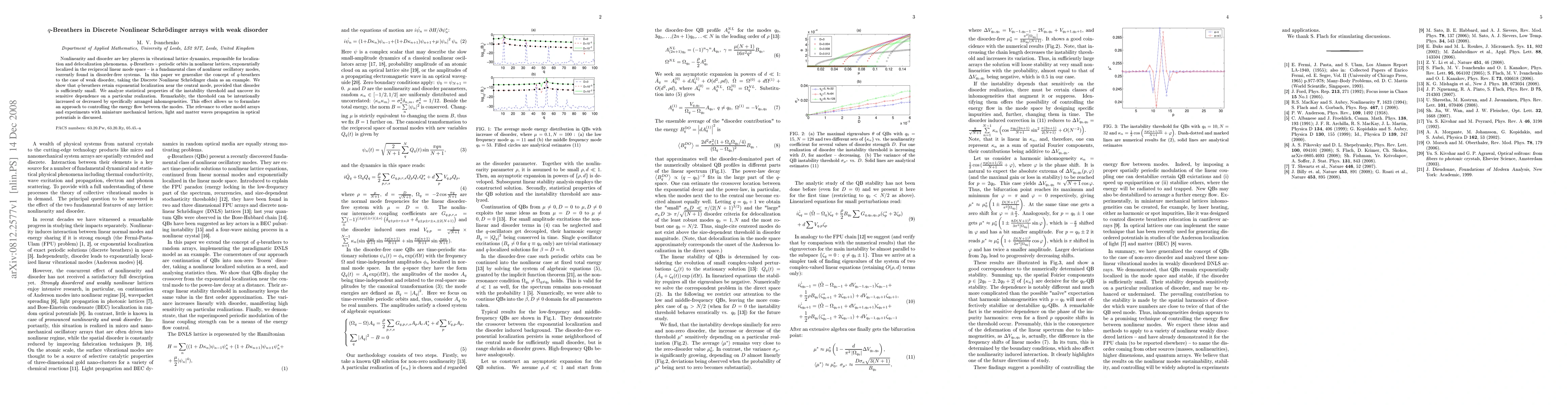 Nonlinearity and disorder are key players in vibrational lattice dynamics, responsible for localization and delocalization phenomena. $q$-Breathers -- periodic orbits in nonlinear lattices, exponentially localized in the reciprocal linear mode space -- is a fundamental class of nonlinear oscillatory modes, currently found in disorder-free systems. In this paper we generalize the concept of $q$-breathers to the case of weak disorder, taking the Discrete Nonlinear Schr\"{o}dinger chain as an example. We show that $q$-breathers retain exponential localization near the central mode, provided that disorder is sufficiently small. We analyze statistical properties of the instability threshold and uncover its sensitive dependence on a particular realization. Remarkably, the threshold can be intentionally increased or decreased by specifically arranged inhomogeneities. This effect allows us to formulate an approach to controlling the energy flow between the modes. The relevance to other model arrays and experiments with miniature mechanical lattices, light and matter waves propagation in optical potentials is discussed.