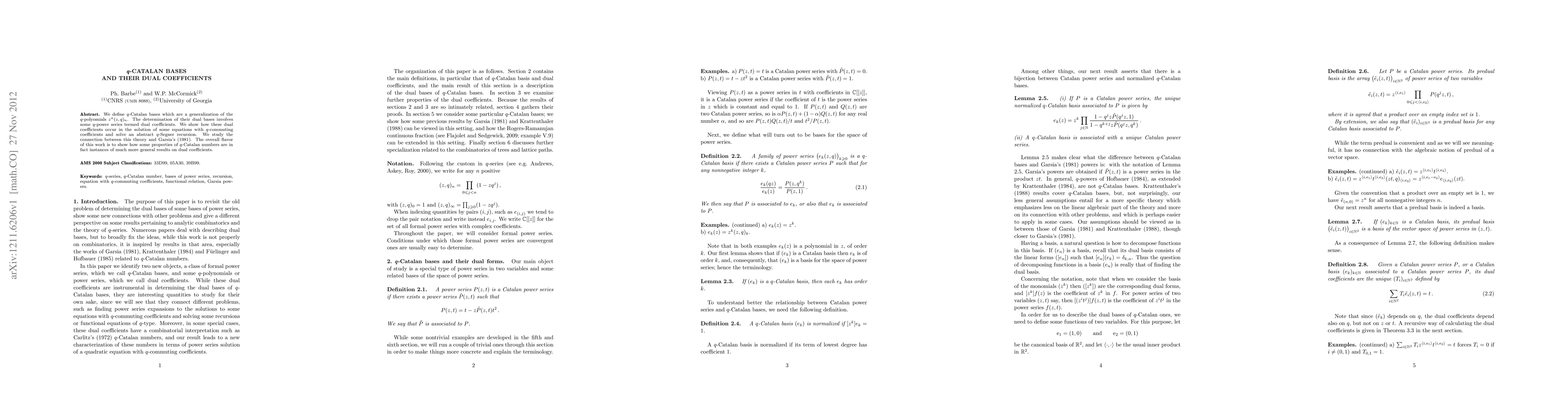 This research paper introduces q-Catalan bases and their dual coefficients, showing how they relate to equations with q-commuting coefficients and the solution of a q-Segner recursion, with implications for generalizing properties of q-Catalan numbers.