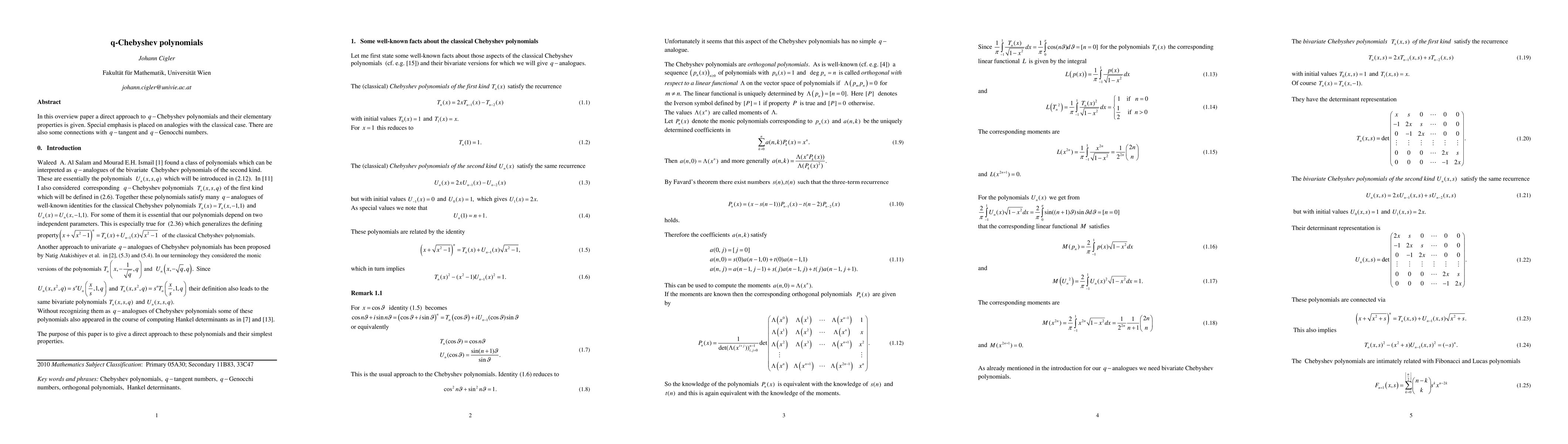 Summary: This paper provides an overview of q-Chebyshev polynomials, highlighting their fundamental properties and comparing them with classical Chebyshev polynomials, while also exploring links to q-tangent and q-Genocchi numbers.