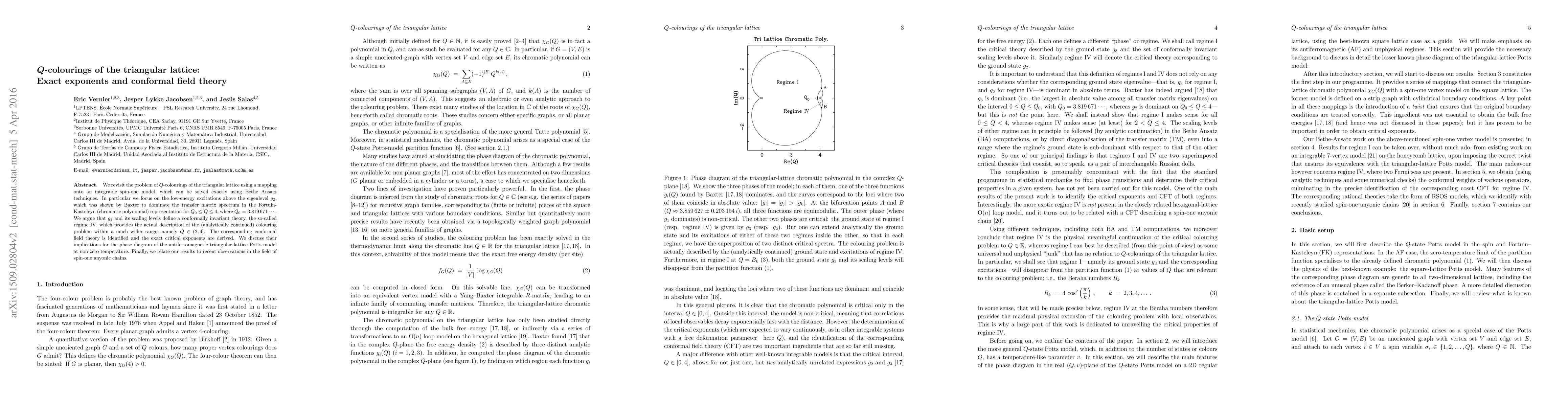We revisit the problem of Q-colourings of the triangular lattice using a mapping onto an integrable spin-one model, which can be solved exactly using Bethe Ansatz techniques. In particular we focus on the low-energy excitations above the eigenlevel g_2, which was shown by Baxter to dominate the transfer matrix spectrum in the Fortuin-Kasteleyn (chromatic polynomial) representation for Q_0 <= Q <= 4, where Q_0 = 3.819671... We argue that g_2 and its scaling levels define a conformally invariant theory, the so-called regime IV, which provides the actual description of the (analytically continued) colouring problem within a much wider range, namely 2 < Q <= 4. The corresponding conformal field theory is identified and the exact critical exponents are derived. We discuss their implications for the phase diagram of the antiferromagnetic triangular-lattice Potts model at non-zero temperature. Finally, we relate our results to recent observations in the field of spin-one anyonic chains.