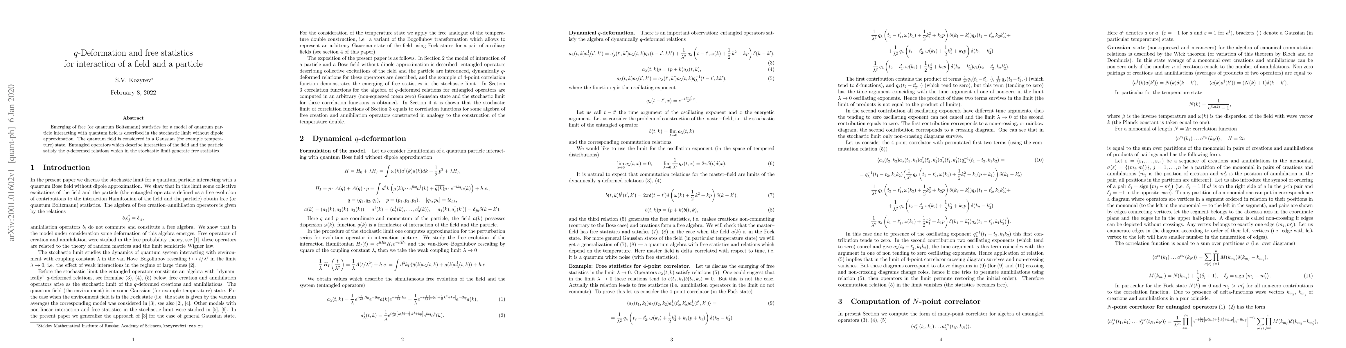 Emerging of free (or quantum Boltzmann) statistics for a model of quantum particle interacting with quantum field is described in the stochastic limit without dipole approximation. The quantum field is considered in a Gaussian (for example temperature) state. Entangled operators which describe interaction of the field and the particle satisfy the q-deformed relations which in the stochastic limit generate free statistics.