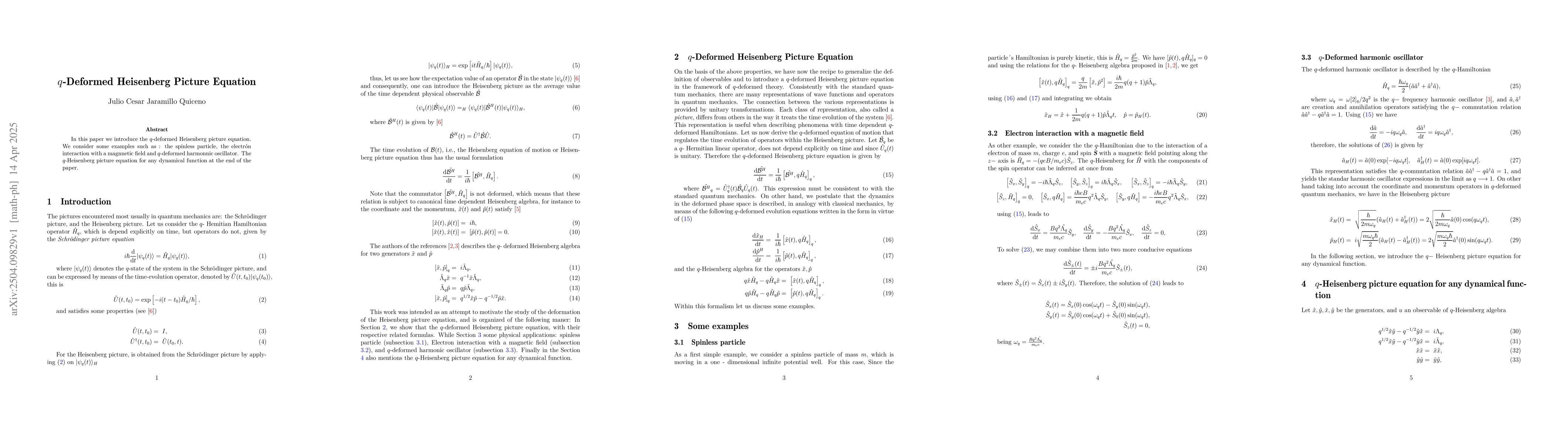The paper introduces the $q$-deformed Heisenberg picture equation, examining examples like the spinless particle, electron interaction with a magnetic field, and $q$-deformed harmonic oscillator.