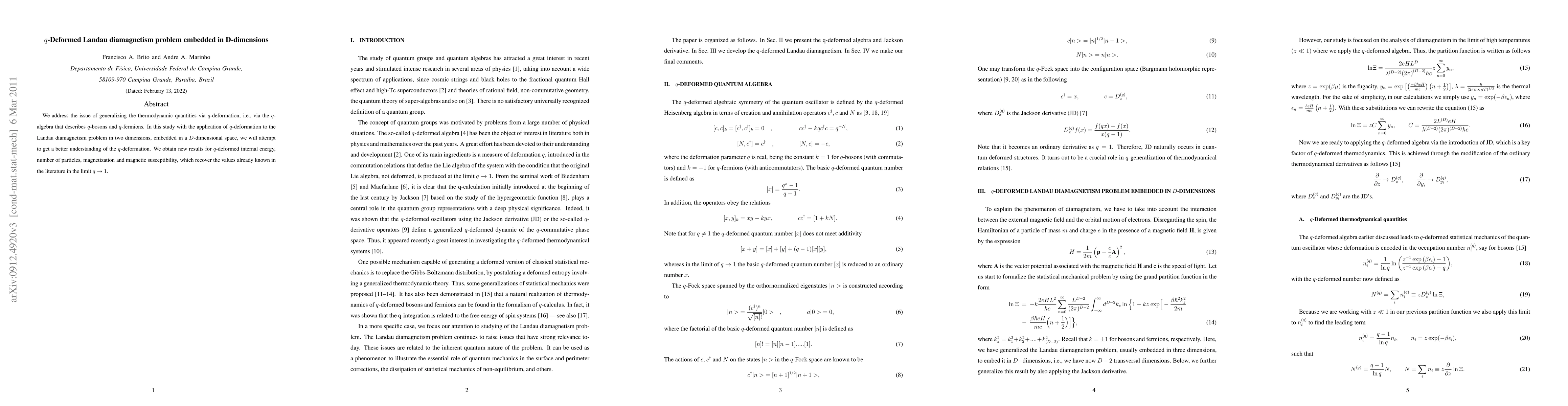 We address the issue of generalizing the thermodynamic quantities via $q$-deformation, i.e., via the $q$-algebra that describes $q$-bosons and $q$-fermions. In this study with the application of $q$-deformation to the Landau diamagnetism problem in two dimensions, embedded in a $D$-dimensional space, we will attempt to get a better understanding of the $q$-deformation. We obtain new results for q-deformed internal energy, number of particles, magnetization and magnetic susceptibility, which recover the values already known in the literature in the limit $q\to1$.