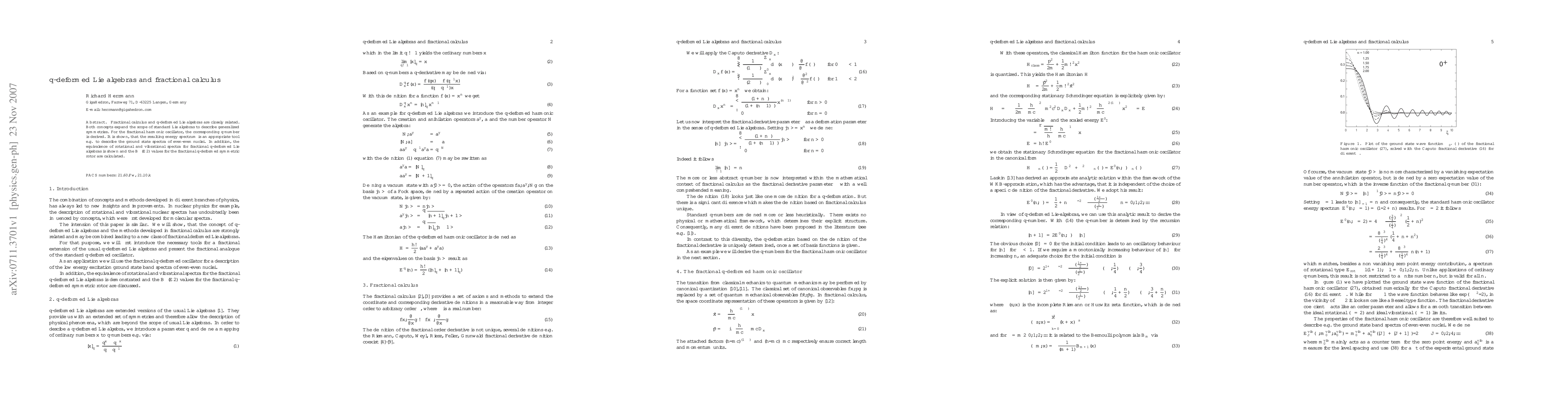 The paper applies fractional calculus to q-deformed Lie algebras, deriving a q-number for the fractional harmonic oscillator and demonstrating its energy spectrum. It also shows the equivalence of rotational and vibrational spectra for fractional q-deformed Lie algebras, and calculates B_α(E2) values for the fractional q-deformed symmetric rotor.