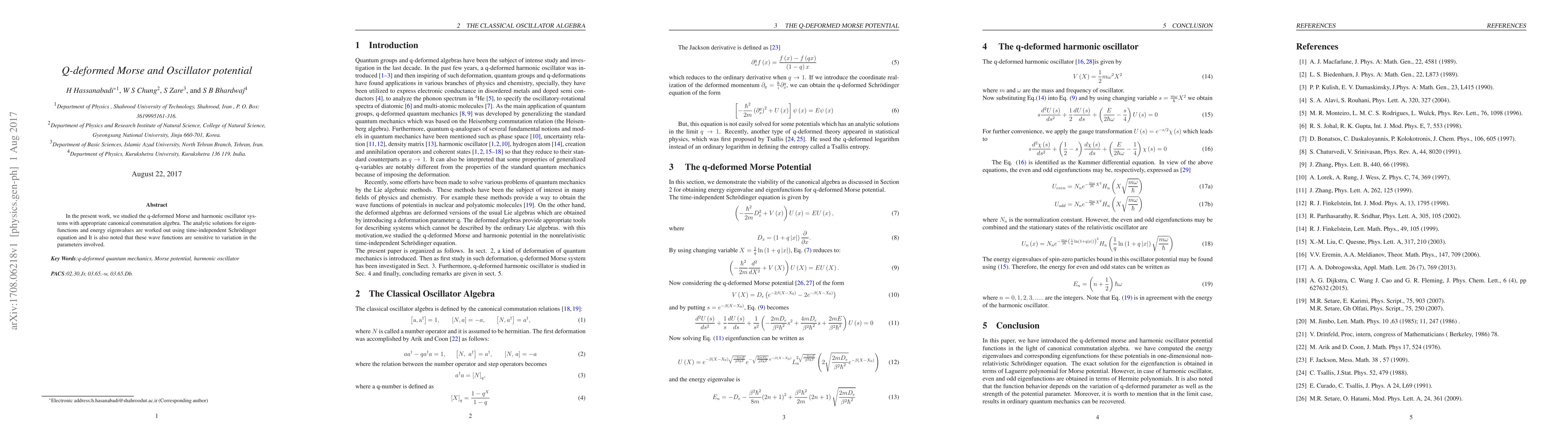This paper investigates q-deformed versions of the Morse and harmonic oscillator potentials, deriving analytic solutions for their eigenfunctions and energy eigenvalues using the time-independent Schrödinger equation. The study highlights the sensitivity of the wave functions to changes in the parameters.