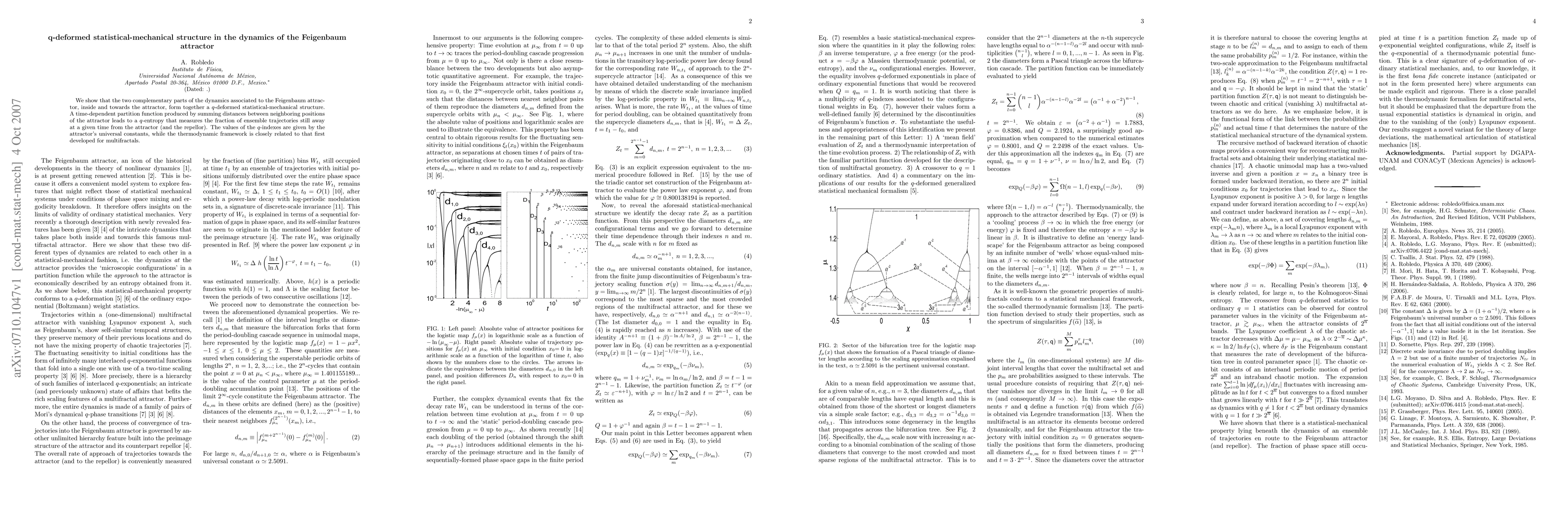 This paper demonstrates that the dynamics of the Feigenbaum attractor exhibit a q-deformed statistical-mechanical structure, where a time-dependent partition function generates a q-entropy that quantifies the fraction of trajectories distant from the attractor, with q-index values determined by the attractor's universal constants.