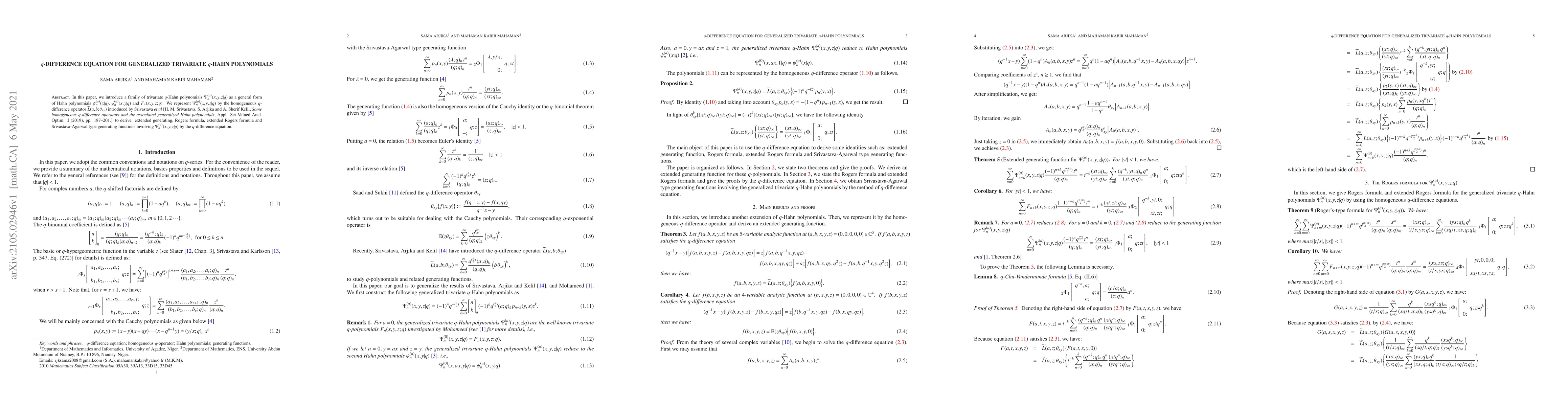 In this paper, we introduce a family of trivariate $q$-Hahn polynomials $\Psi_n^{(a)}(x,y,z|q)$ as a general form of Hahn polynomials $\psi_n^{(a)}(x|q),$ $\psi_n^{(a)}(x,y|q)$ and $F_n(x,y,z;q)$. We represent $\Psi_n^{(a)}(x,y,z|q)$ by the homogeneous $q$-difference operator $\widetilde{L}(a,b; \theta_{xy})$ introduced by Srivastava {\it et al} [H. M. Srivastava, S. Arjika and A. Sherif Kelil, {\it Some homogeneous $q$-difference operators and the associated generalized Hahn polynomials}, Appl. Set-Valued Anal. Optim. {\bf 1} (2019), pp. 187--201.] to derive: extended generating, Rogers formula, extended Rogers formula and Srivastava-Agarwal type generating functions involving $\Psi_n^{(a)}(x,y,z|q)$ by the $q$-difference equation.