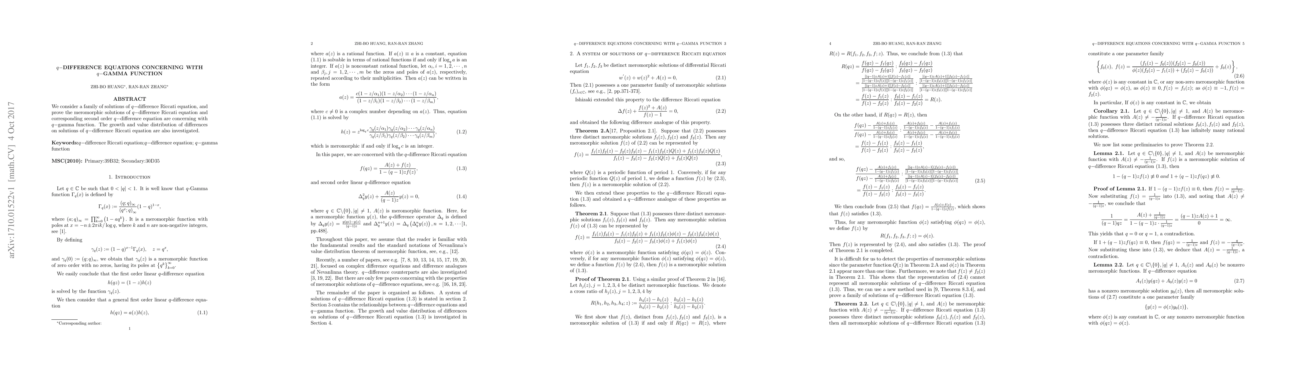 This paper investigates the connection between q-difference Riccati equations and the q-gamma function, exploring meromorphic solutions and growth rates of their differences.