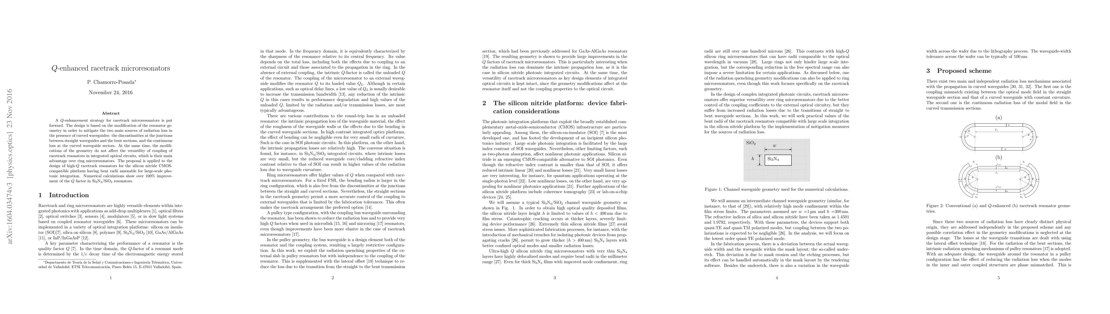 A $Q$-enhancement strategy for racetrack microresonators is put forward. The design is based on the modification of the resonator geometry in order to mitigate the two main sources of radiation loss in the presence of curved waveguides: the discontinuities at the junctions between straight waveguides and the bent sections, and the continuous loss at the curved waveguide sectors. At the same time, the modifications of the geometry do not affect the versatility of coupling of racetrack resonators in integrated optical circuits, which is their main advantage over ring microresonators. The proposal is applied to the design of high-$Q$ racetrack resonators for the silicon nitride CMOS-compatible platform having bent radii amenable for large-scale photonic integration. Numerical calculations show over $100\%$ improvement of the $Q$ factor in $\text{Si}_3\text{N}_4/\text{SiO}_2$ resonators.