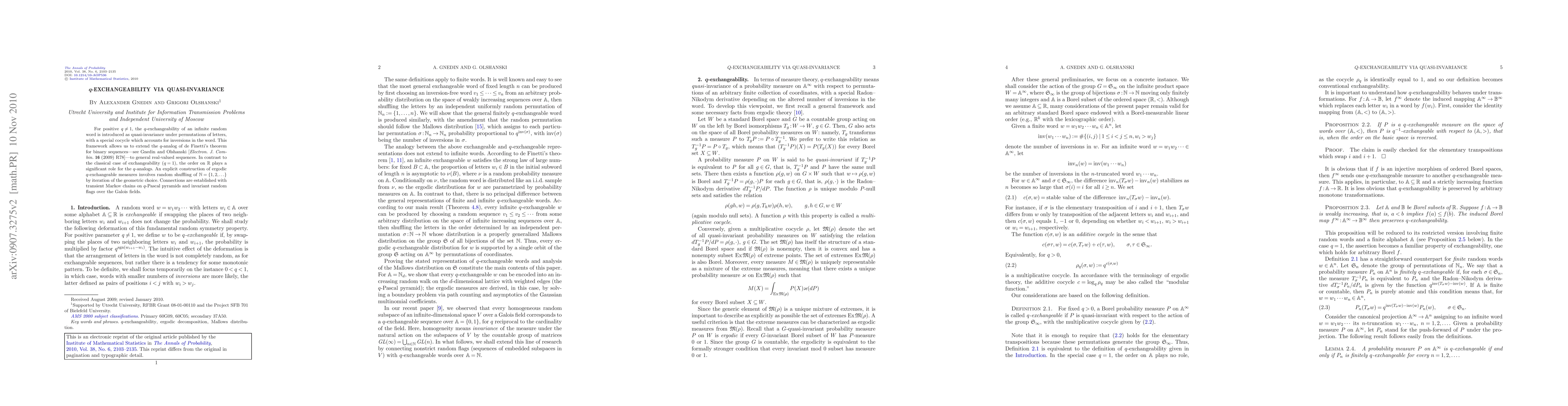 This paper introduces $q$-exchangeability for infinite random words via quasi-invariance under letter permutations, extending the $q$-analog of de Finetti's theorem to real-valued sequences. It constructs ergodic $q$-exchangeable measures through random shuffling of natural numbers and links these measures to transient Markov chains and invariant random flags.