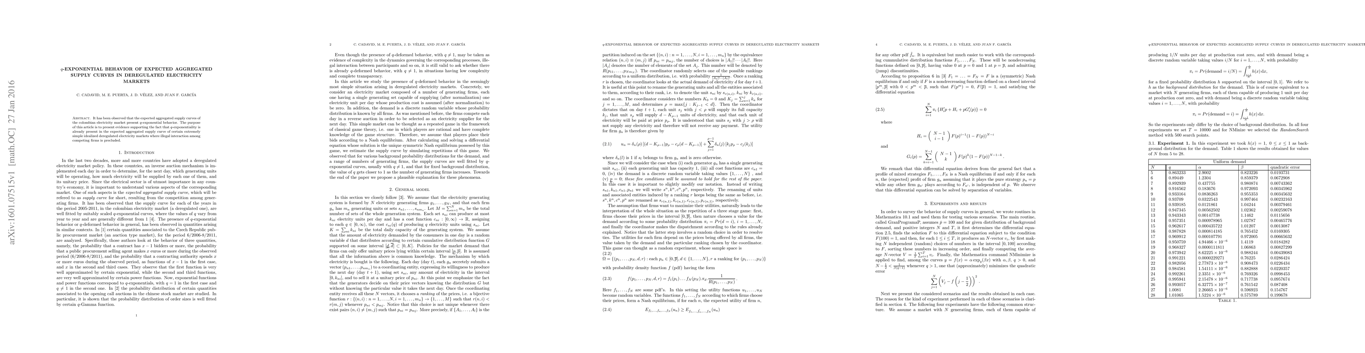 It has been observed that the expected aggregated supply curves of the colombian electricity market present q-exponential behavior. The purpose of this article is to present evidence supporting the fact that q-exponentiality is already present in the expected aggregated supply curve of certain extremely simple idealized deregulated electricity markets where illegal interaction among competing firms is precluded.