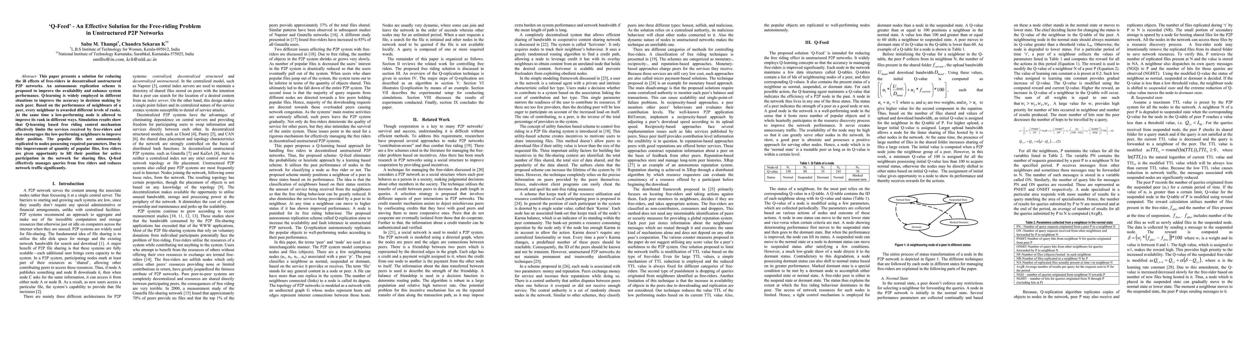 This paper presents a solution for reducing the ill effects of free-riders in decentralised unstructured P2P networks. An autonomous replication scheme is proposed to improve the availability and enhance system performance. Q-learning is widely employed in different situations to improve the accuracy in decision making by each peer. Based on the performance of neighbours of a peer, every neighbour is awarded different levels of ranks. At the same time a low-performing node is allowed to improve its rank in different ways. Simulation results show that Q-learning based free riding control mechanism effectively limits the services received by free-riders and also encourages the low-performing neighbours to improve their position. The popular files are autonomously replicated to nodes possessing required parameters. Due to this improvement of quantity of popular files, free riders are given opportunity to lift their position for active participation in the network for sharing files. Q-feed effectively manages queries from free riders and reduces network traffic significantly