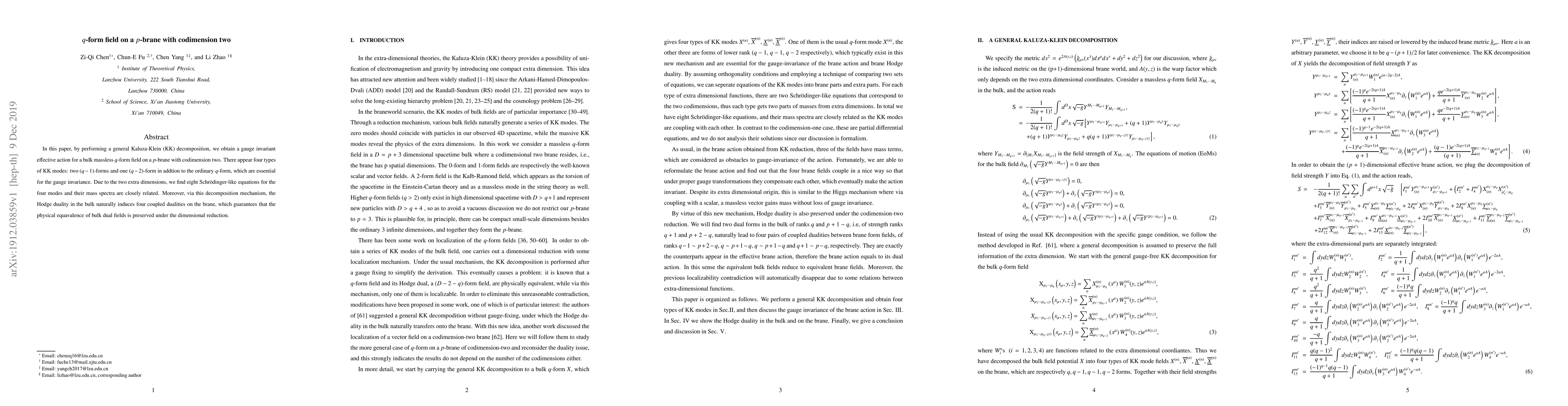 In this paper, by performing a general Kaluza-Klein (KK) decomposition, we obtain a gauge invariant effective action for a bulk massless $q$-form field on a $p$-brane with codimension two. There appear four types of KK modes: two $(q-1)$-forms and one $(q-2)$-form in addtion to the ordinary $q$-form, which are essential for the gauge invariance. Due to the two extra dimensions, we find eight Schr\"{o}dinger-like equations for the four modes and their mass spectra are closely related. Moreover, via this decomposition mechanism, the Hodge duality in the bulk naturally induces four coupled dualities on the brane, which guarantees that the physical equavalence of bulk dual fields is preserved under the dimensional reduction.