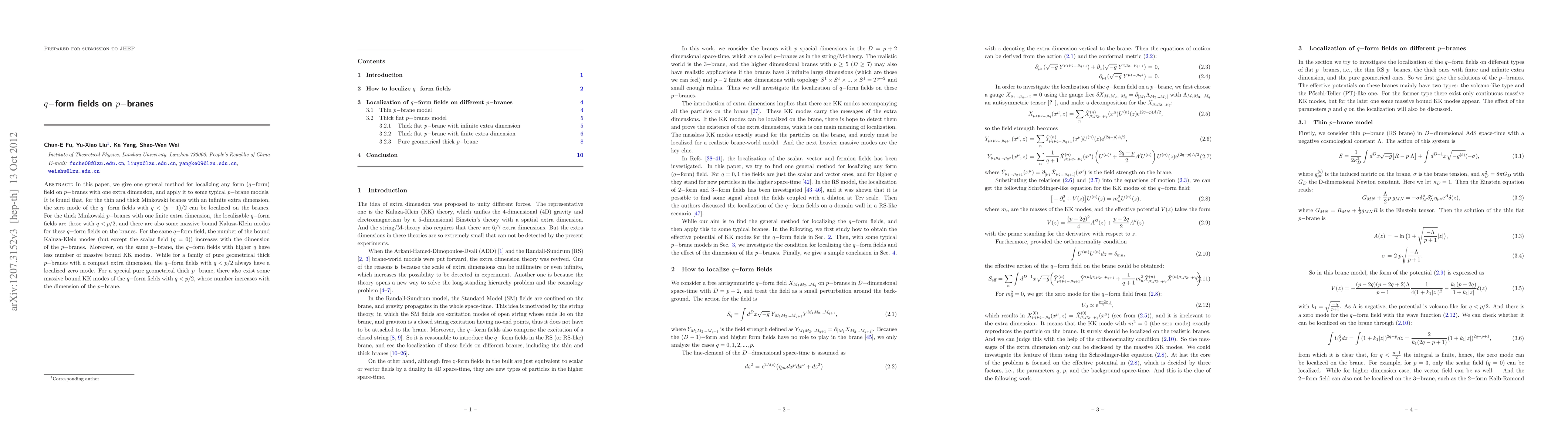 This paper presents a method for localizing q-form fields on p-branes with an extra dimension, showing that certain q-form fields can be localized depending on the brane's thickness and the extra dimension's nature. It reveals that the number of bound Kaluza-Klein modes for these fields increases with p-brane dimension, while higher q-form fields generally have fewer massive modes.