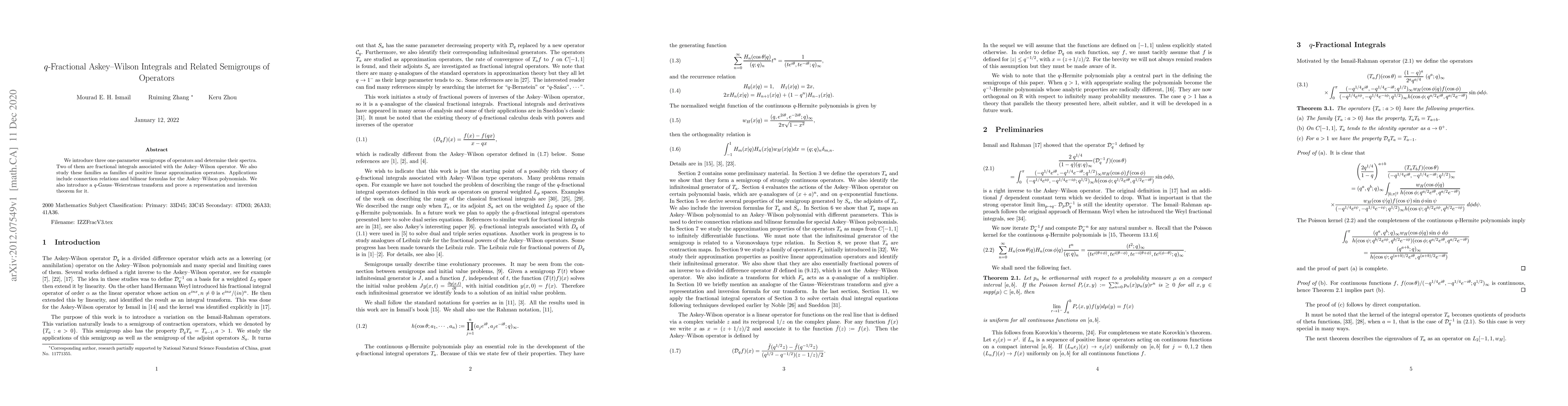 This paper introduces three operator semigroups related to q-fractional integrals and the Askey-Wilson operator, determining their spectra and studying their applications, including connections to Askey-Wilson polynomials and a new q-Gauss-Weierstrass transform with a representation and inversion theorem.