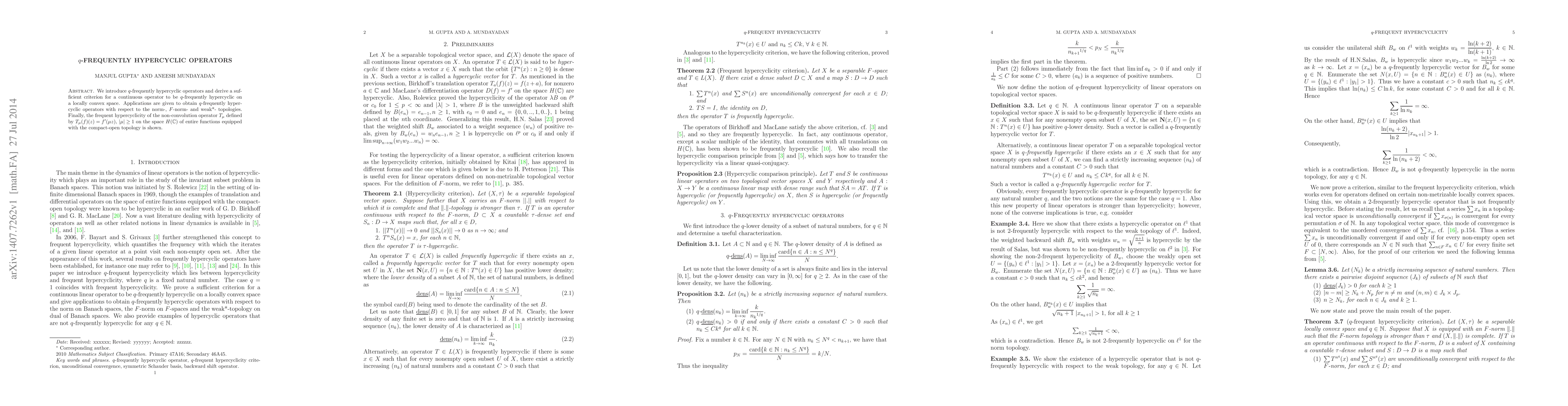 We introduce q-frequently hypercyclic operators and derive a sufficient criterion for a continuous operator to be q-frequently hypercyclic on a locally convex space. Applications are given to obtain q-frequently hypercyclic operators with respect to the norm-, F-norm- and weak*- topologies. Finally, the frequent hypercyclicity of the non-convolution operator $T_\mu$ defined by $T_\mu(f)(z) = f'(\mu z)$, $\mu\ge1$ on the space $H(\mathbb{C})$ of entire functions equipped with the compact-open topology is shown.