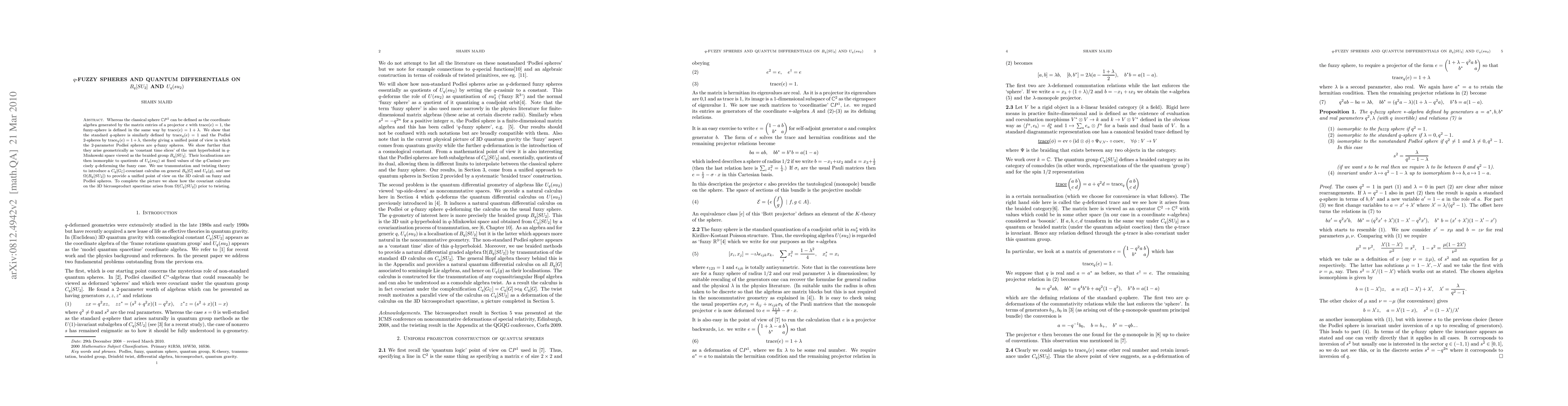 Whereas the classical sphere $C P^1$ can be defined as the coordinate algebra generated by the matrix entries of a projector $e$ with $\trace(e)=1$, the fuzzy-sphere is defined in the same way by $\trace(e)=1+\lambda$. We show that the standard $q$-sphere is similarly defined by $\trace_q(e)=1$ and the Podles 2-spheres by $\trace_q(e)=1+\lambda$, thereby giving a unified point of view in which the 2-parameter Podles spheres are $q$-fuzzy spheres. We show further that they arise geometrically as `constant time slices' of the unit hyperboloid in $q$-Minkowski space viewed as the braided group $B_q[SU_2]$. Their localisations are then isomorphic to quotients of $U_q(su_2)$ at fixed values of the $q$-Casimir precisely $q$-deforming the fuzzy case. We use transmutation and twisting theory to introduce a $C_q[G_C]$-covariant calculus on general $B_q[G]$ and $U_q(g)$, and use $\Omega(B_q[SU_2])$ to provide a unified point of view on the 3D calculi on fuzzy and Podles spheres. To complete the picture we show how the covariant calculus on the 3D bicrossproduct spacetime arises from $\Omega(C_q[SU_2])$ prior to twisting.