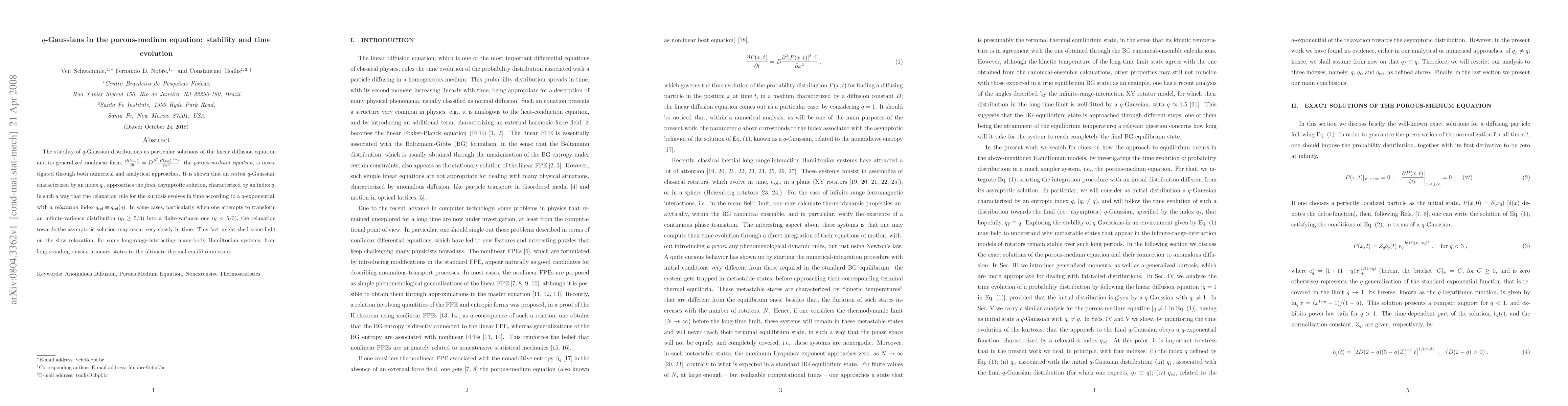 The stability of $q$-Gaussian distributions as particular solutions of the linear diffusion equation and its generalized nonlinear form, $\pderiv{P(x,t)}{t} = D \pderiv{^2 [P(x,t)]^{2-q}}{x^2}$, the \emph{porous-medium equation}, is investigated through both numerical and analytical approaches. It is shown that an \emph{initial} $q$-Gaussian, characterized by an index $q_i$, approaches the \emph{final}, asymptotic solution, characterized by an index $q$, in such a way that the relaxation rule for the kurtosis evolves in time according to a $q$-exponential, with a \emph{relaxation} index $q_{\rm rel} \equiv q_{\rm rel}(q)$. In some cases, particularly when one attempts to transform an infinite-variance distribution ($q_i \ge 5/3$) into a finite-variance one ($q<5/3$), the relaxation towards the asymptotic solution may occur very slowly in time. This fact might shed some light on the slow relaxation, for some long-range-interacting many-body Hamiltonian systems, from long-standing quasi-stationary states to the ultimate thermal equilibrium state.