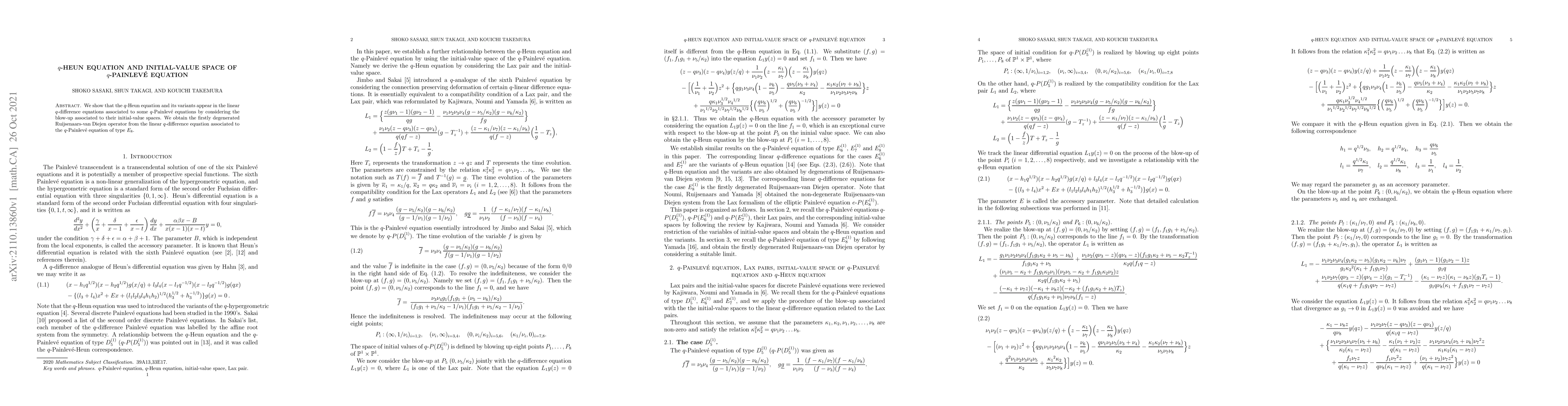 This paper demonstrates that the q-Heun equation and its variants emerge in the linear q-difference equations linked to certain q-Painlevé equations through the analysis of their initial-value spaces. It also derives the first degenerated Ruijsenaars-van Diejen operator from the linear q-difference equation associated with the q-Painlevé equation of type $E_8$.
