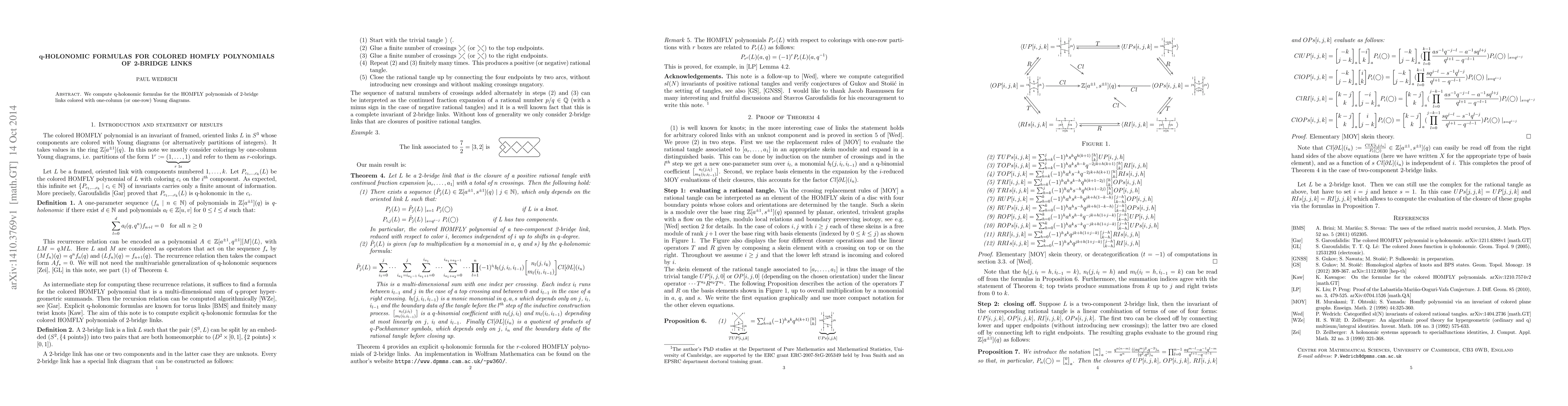 The paper derives q-holonomic formulas for the HOMFLY polynomials of 2-bridge links when they are colored using one-column (or one-row) Young diagrams, providing a systematic method for these computations. This work extends the understanding of knot coloring and its implications in quantum topology.