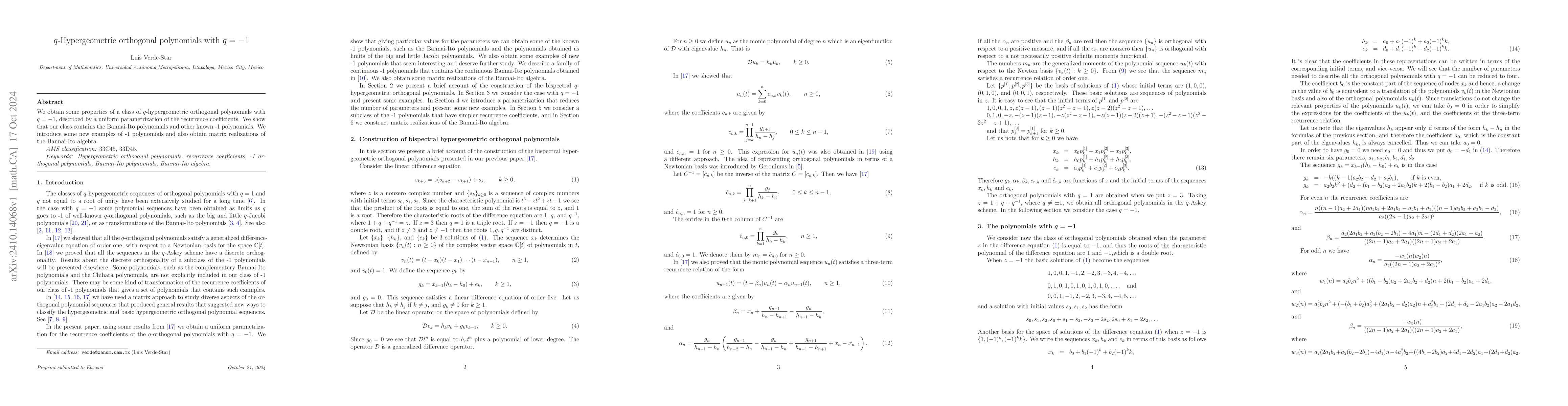 This paper explores $q$-hypergeometric orthogonal polynomials with $q=-1$, presenting a uniform parametrization of their recurrence coefficients and showing that it includes the Bannai-Ito polynomials and other known $-1$ polynomials, along with introducing new examples and matrix realizations of the Bannai-Ito algebra.