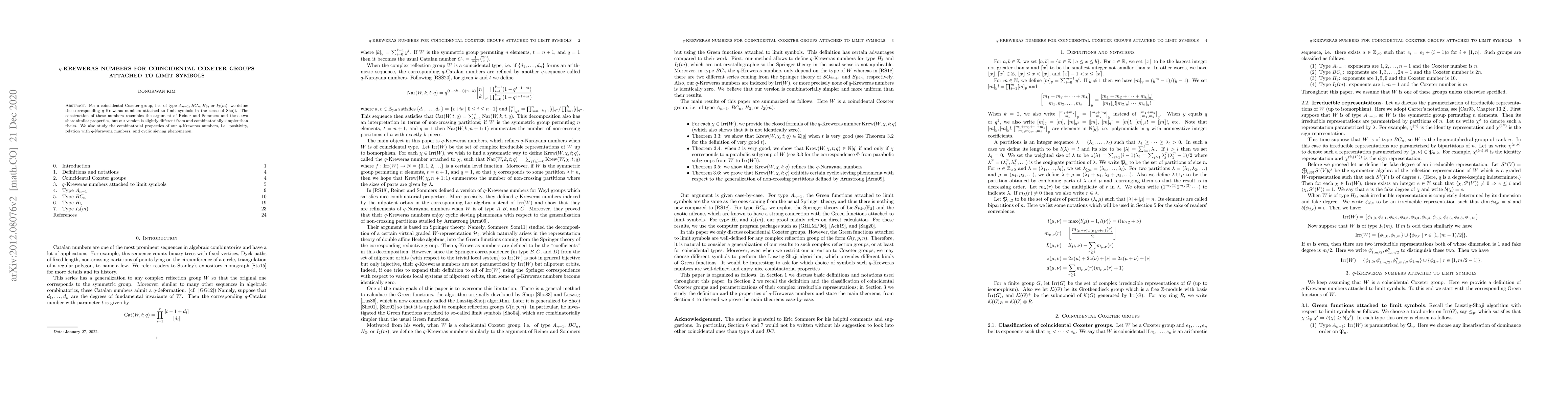 For a coincidental Coxeter group, i.e. of type $A_{n-1}, BC_n, H_3,$ or $I_2(m)$, we define the corresponding $q$-Kreweras numbers attached to limit symbols in the sense of Shoji. The construction of these numbers resembles the argument of Reiner and Sommers and these two share similar properties, but our version is slightly different from and combinatorially simpler than theirs. We also study the combinatorial properties of our $q$-Kreweras numbers, i.e. positivity, relation with $q$-Narayana numbers, and cyclic sieving phenomenon.