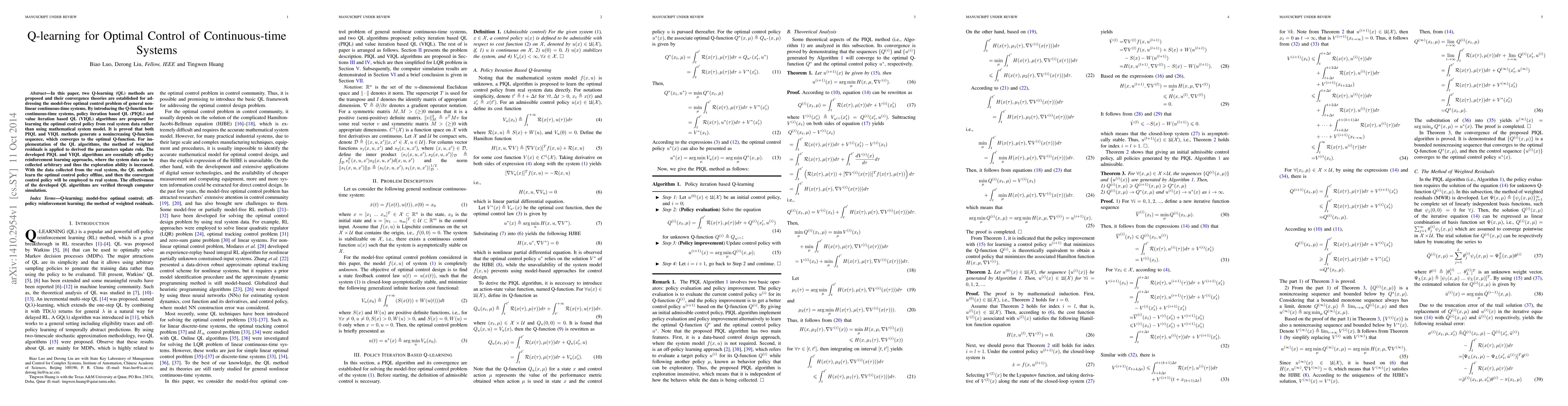 This paper proposes two Q-learning methods, PIQL and VIQL, for optimal control of nonlinear continuous-time systems without relying on a mathematical model. Both algorithms are shown to converge to the optimal Q-function and are verified through computer simulations.