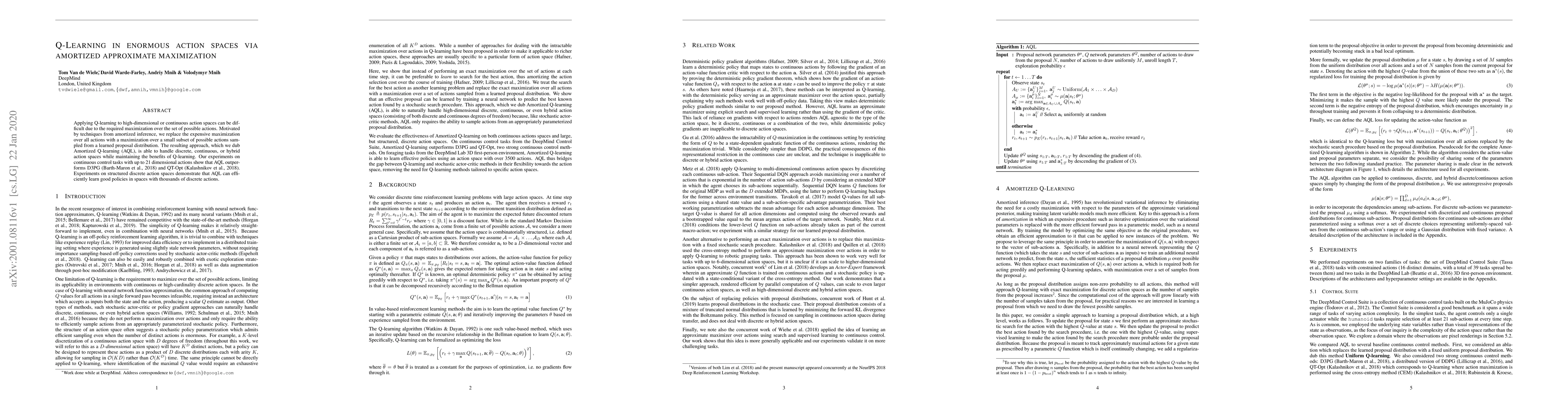 This paper proposes Amortized Q-learning (AQL) to tackle the challenge of Q-learning in large action spaces by replacing the costly maximization over all actions with a sampled subset from a learned distribution. AQL effectively handles discrete, continuous, or hybrid action spaces and outperforms existing methods on continuous control tasks and large discrete action spaces.